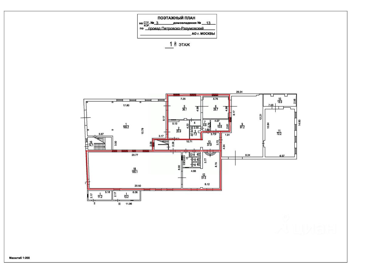 Коммерческое помещение площадью 749.8 м², расположено по адресу: г. Москва, Петровско-Разумовский проезд, 13с3, помещение 1/1, район Савёловский. Объект занимает 1 и 2 этажи в здании с этажностью 2 этажа. Помещение требует ремонта, свободного назначения, имеет отдельный вход. Здание относится к типу нежилого, построено в 1917 году.
