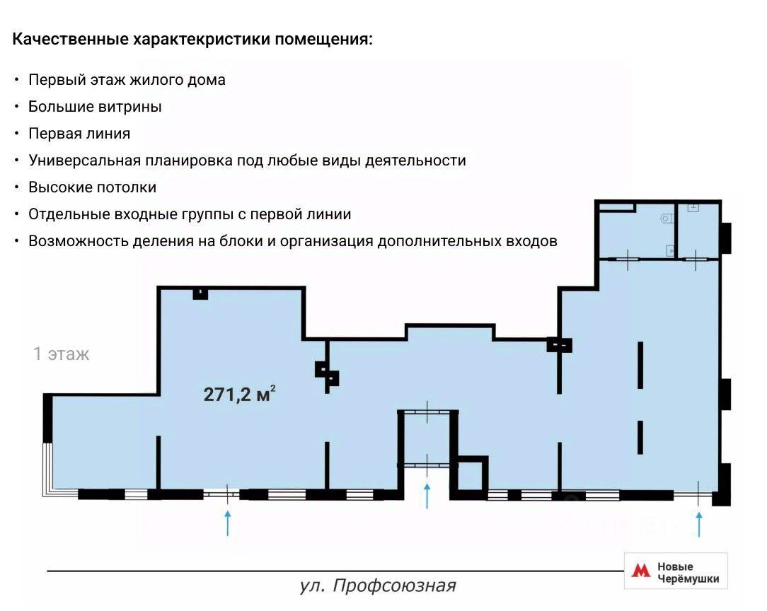 Описание Продажа Street Retail помещения торгового или свободного назначения (ПСН) площадью 271,2 кв.м на 1 этаже жилого здания. Большие витрины. Универсальная планировка под любые виды деятельности. Высокие потолки. Возможность деления на блоки и организации дополнительных входов. Застройщик Московский фонд реновации жилой застройки Отдельные входные группы с 1ой линии. Интенсивный пешеходный трафик вдоль витрин (более 1000 человек в час). Условия продажи Схема сделки: договор долевого участия (ДДУ). Срок завершения строительства: до 31.12.2026 г. Прогнозная ежегодная индексация/инфляция: не менее 7%. Застройщик Московский фонд реновации жилой застройки. Отдельные входные группы с 1-ой линии. Интенсивный пешеходный трафик вдоль витрин (более 1000 человек в час). Расположение Предлагается на продажу помещение на улице Профсоюзная, ЮЗАО, г. Москва. Продажа помещения у метро. Шаговая доступность от ст. метро ''Новые Черёмушки'' — менее 1 минуты пешком. Отличная пешеходная и транспортная доступность. Помещение расположено в районе с высокой плотностью застройки и развитой инфраструктурой. В окружении находятся торговые центры ''Панорама'', ''Черёмушки'', жилые комплексы ''Дирижабль'',''Родной город'', ''Nametkin Tower'', нефтегазовые компании ''КазРосГаз'', ''Газпром трансгаз''.