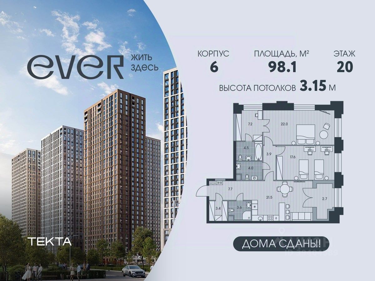 Рассрочка 0% с платежом от 120 000 ? в месяц. 3-комн. квартира в ЖК ''Ever'' на 20 этаже в 34 этажном здании Корпус 6. Общая площадь: 98.1 кв.м., жилая: 52.4 кв.м. Высота потолков 3.15 м. ЖК EVER это современный жилой комплекс в районе Обручева, всего в 7 минутах ходьбы от метро Калужская. В ЖК EVER представлены комфортабельные квартиры с разнообразными планировками, включая редкие форматы с мастер-спальнями и зимними садами. Благоустроенная территория с акцентом на природные элементы создает атмосферу спокойствия и уюта. В комплексе есть подземный паркинг и кладовые помещения. EVER это сочетание комфорта городской жизни и близости к природе.