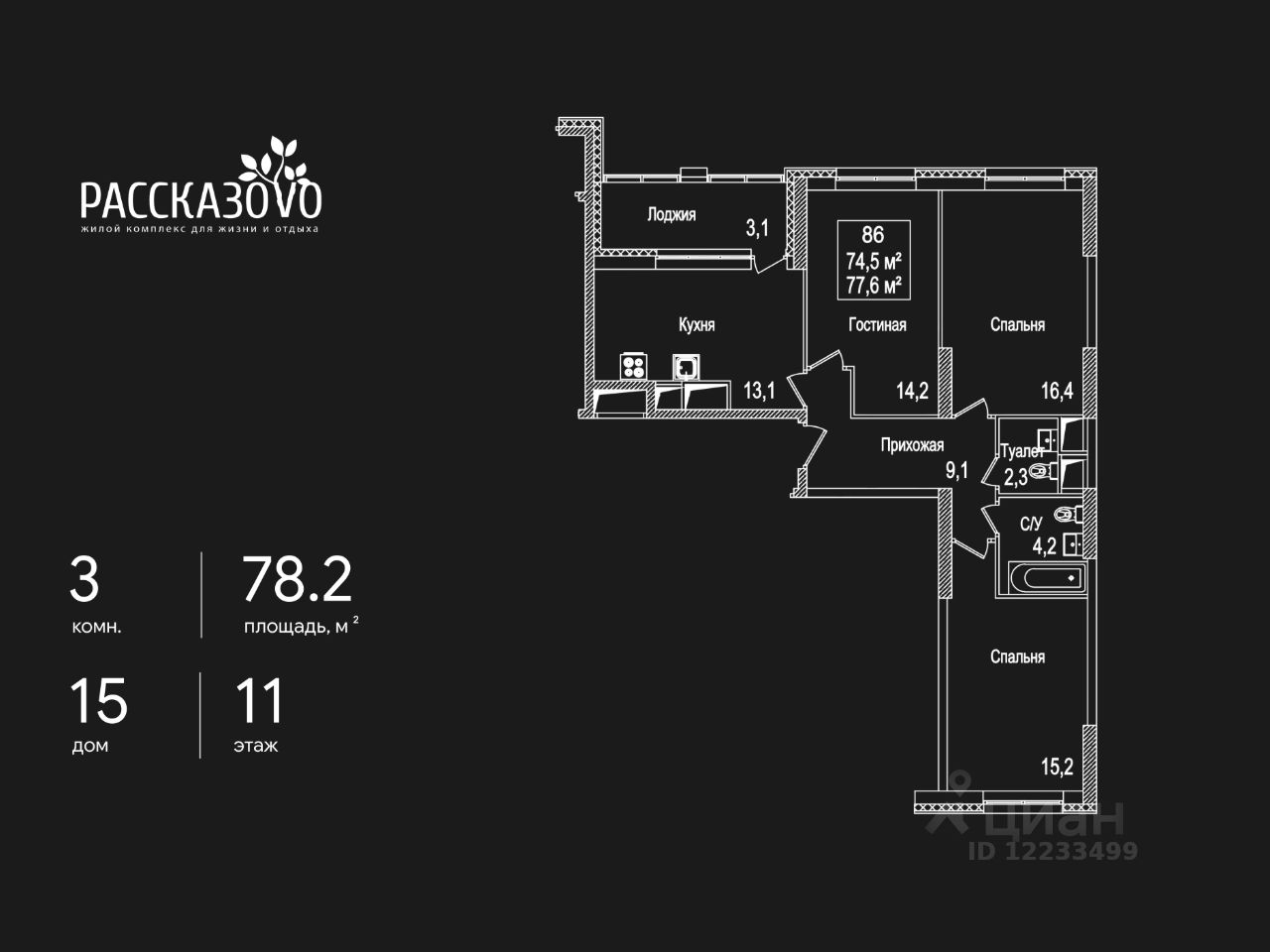 Продается 3-комнатная квартира в ЖК Рассказово на 11 этаже. Общая площадь квартиры составляет 78,2 кв.м. Квартира без отделки. Уникальность комплекса в его архитектуре все дома построены в стиле Москвы 30-х годов, создавая неповторимое ощущение присутствия романтики того времени. Роскошные входные группы, отделанные мрамором, с высотой потолков 4,5 м, белыми лепными карнизами и стойкой ресепшн с авторской отделкой создают атмосферу уюта, полностью отражая дух и воплощение уникальной архитектурной концепции 30-40 годов, являясь ее логическим продолжением. Преимущество локации заключается в благоприятной экологической обстановке с трех сторон комплекс окружен Ульяновским лесопарком и отсутствием промышленных предприятий, обеспечивая жителей чистым воздухом. До ближайшей станции метро ''Рассказовка'' всего 850 метров, а до центра можно доехать за 30 минут. Проект предполагает комплексное освоение территории, создание комфортной жилой застройки с развитой качественной инфраструктурой: - большое количество парковочных мест предусмотрены как закрытые подземные паркинги, так и крытые наземные парковки с дополнительно выделенными открытыми парковочными местами возле домов, - круглосуточно охраняемая территория, закрытая от посторонних для безопасности каждого жителя, - двор-парк без машин, где можно не переживать за играющих детей, - социальные объекты: своя поликлиника, детские сады и школы, - здоровая среда: воркаут - площадки, обустроенные места для занятий спортом на свежем воздухе, живописные места для утренних пробежек, велосипедные маршруты любой сложности, - благоустроенная набережная лесного озера для тихих прогулок или семейного отдыха, - коммерческие объекты действующие магазины, кафе и салоны красоты. Узнайте больше о комплексе приезжайте на просмотр, записавшись по телефону. Менеджер вас встретит, угостит вкусным кофе, проведет по территории и покажет квартиру.