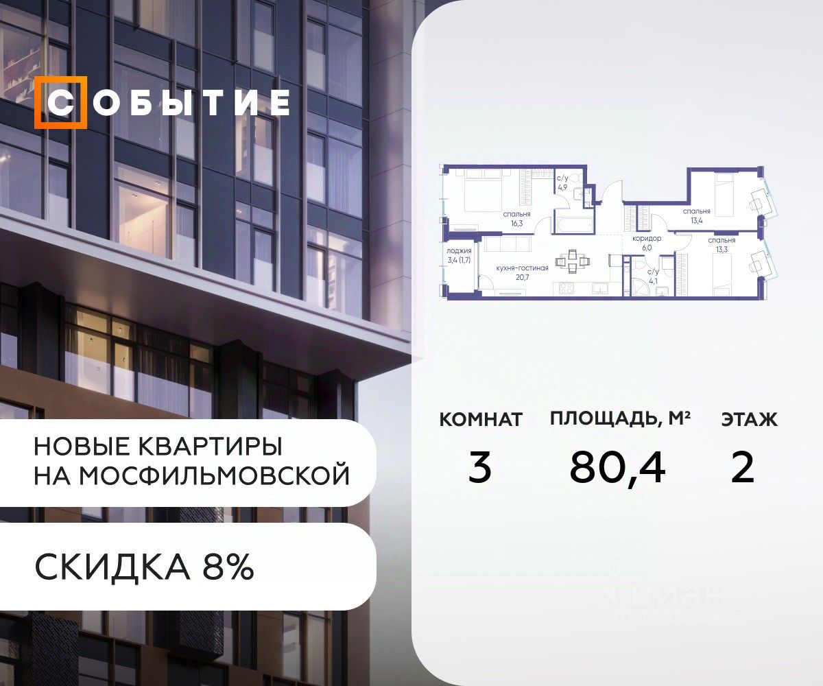 Около 10 минут до Москва Сити и ТТК! В продаже студия от застройщика. Общая площадь 31.9, жилая 7.9, кухня 24. Квартира расположена на 2 этаже жилого квартала ''Событие-6'', корпус 2, Секция Секция 5. Квартира без отделки. Срок сдачи: 4 кв. 2029 года. СОБЫТИЕ.6 — финальный дом парк квартала СОБЫТИЕ на Мосфильмовской, созданный для тех, кто хочет ''заняться жизнью'' здесь и сейчас и получать максимум от каждого дня. Стильная архитектура, продуманное благоустройство и богатый набор общественных пространств делают дом естественной сценой для ярких личных событий. Архитектура от бюро Atrium на базе дизайн кода британских LDA Design и UHA London. Лучшая новостройка страны 2025 года! Расположение: • Около 710 минут пешком до станций метро ''Аминьевская'' и ''Мичуринский проспект'' (в зависимости от маршрута) • Около 15 минут до Садового кольца • Около 25 минут до аэропорта Внуково • Рядом — ключевые магистрали (Кутузовский, Мичуринский, Ломоносовский проспекты, Аминьевское шоссе), что упрощает выезды как в центр, так и за город Инфраструктура ''всё у дома'' Главный центр притяжения — модный парк ''Событие'' от бюро Wowhaus. Благоустроенный бульвар и рекреационные зоны занимают около половины территории квартала, а природная часть парка площадью более 12 гектаров уже открыта. В парке проложены: • примерно 1,5 км беговых дорожек • около 2,7 км велодорожек • около 1,6 км экотропы • детские и спортивные площадки, места для пикника, лекторий, декоративный огород, восстановленные биотопы • Парк ''Событие'' — финалист конкурса Правительства Москвы в номинации ''Строительство парков и общественных пространств'' Мультидвор Двор СОБЫТИЯ.6 — это мультимодальное пространство для жителей всех возрастов. Здесь предусмотрены: • игровые и развивающие площадки для малышей и детей постарше • воркаут зоны, площадки для игр с мячом и йоги для активных взрослых • мини бульвар с фонтаном для прогулок • террасы, амфитеатры и лаунжи для спокойного отдыха и встреч • Комьюнити террасы и общественные пространства на кровле 10 этажа Внутри дома предусмотрен полный набор общественных пространств: • детская игровая комната и детский клуб • спортрум / фитнес рум • коворкинг и комнаты для занятий с репетитором • дизайнерские лаунж зоны для деловых и личных встреч Район и окружение: парки, университеты, спорт Район относится к числу самых экологичных в Москве: он буквально утопает в зелени парков и заповедников. В окружении — парк ''Событие'', природный заказник ''Долина реки Раменки'', Воробьевы горы, Матвеевский лес, парк 50 летия Октября, парк Олимпийской деревни, Вороновский парк, набережные Москвы реки, заказник ''Долина реки Сетунь''. Это настоящая ''интеллектуальная миля'' Москвы: рядом МГУ имени М. В. Ломоносова, ботанический сад МГУ, театр им. Н. И. Сац, Новодевичий монастырь, стадион ''Лужники'', Парк Победы и другие знаковые объекты. Район особенно комфортен для сторонников ЗОЖ: множество мест для бега, велопрогулок, спорта на открытом воздухе и занятий в