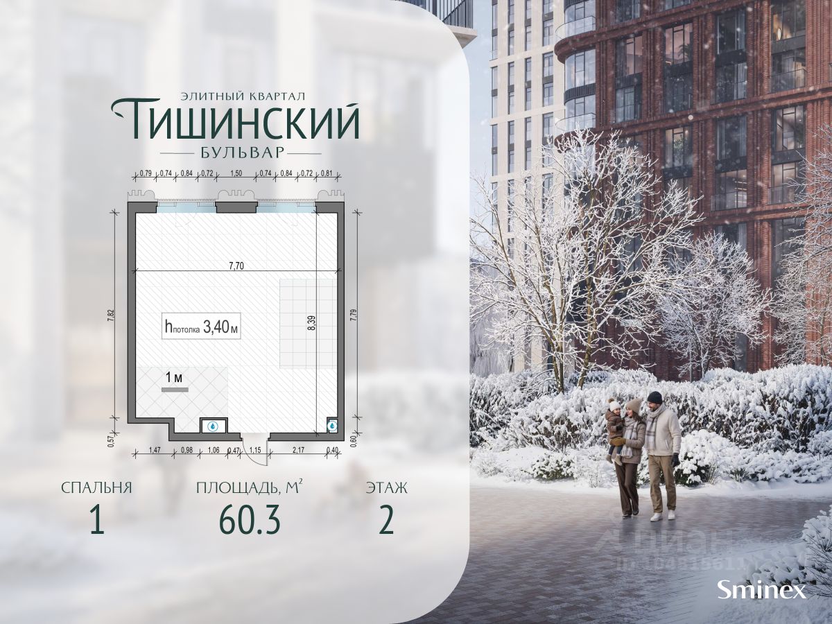 В продаже 1-комнатная квартира квартира в элитном квартале ''Тишинский бульвар''. Общая площадь квартиры - 60.30 кв.м. Этаж 2 из 14. Корпус К4С1. ''Тишинский бульвар'' - тихий зелёный элитный квартал на Тишинке, в престижном и комфортном районе центра Москвы. В нём создан уникальный для элитного дома прогулочный бульвар в своём огромном парке 1,9 га. В парке оборудованы зоны для активного и тихого отдыха, крытые галереи, приватные зелёные комнаты, многофункциональная спортивная площадка, воркаут-зона, детская площадка, сухой фонтан, ручей. В пешей доступности Римско-католический кафедральный собор. Всего в полутора километрах от квартала находятся Патриаршие пруды - излюбленное место для летних прогулок, воскресных бранчей и романтических ужинов. Белая площадь расположена ещё ближе - на расстоянии 1,2 километра. Это точка концентрации деловой жизни и модных ресторанов. В ''Тишинский бульваре'' только для жителей и их гостей создан уникальный для элитного дома прогулочный бульвар в собственном огромном парке площадью 2,1 га, который занимает 70% территории квартала. Бульвар проходит через весь квартал и объединяет в общее пространство три двора: Кленовый, Рябиновый и Ивовый. В парке созданы крытые галереи и приватные зелёные комнаты для отдыха и медитаций в любую погоду. Насыщенное озеленение многолетними растениями с разными периодами цветения сохраняет территорию квартала красивой круглый год. В квартале насыщенная инфраструктура только для жителей, включая Clubhouse. Здесь оборудованы пространства для здорового образа жизни по стандарту FIT LAB: в парке - многофункциональная спортивная площадка, воркаут-зона, место для занятий йогой и медитации, бесплатный фитнес-клуб с бассейном. Для маленьких жителей доступны детская площадка и игровая комната по стандарту KIDS LAB. Дома оснащены самыми полными и лучшими системами.