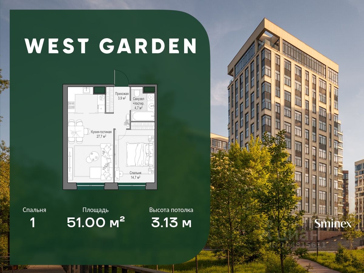 Комфортная и продуманная до мелочей 1-спальная квартира площадью 51.00 кв. м на 12 этаже в клубном доме 8. Увеличенная площадь окон и высота потолков 3.13 м дарят впечатляющие виды на парки, зеленые зоны и природные заказники. West Garden - это собрание клубных домов высотой 12-14 этажей в собственном парке 16 гектаров вдоль реки. Просторный среднеэтажный квартал расположен на Минской улице, в респектабельном Западном округе столицы. Вокруг премиальное окружение и более 1000 гектаров парков. West Garden - это возможность обеспечить себе и своей семье лучшие условия для жизни в одном из самых привлекательных и зелёных районов столицы. Гармония природы дополнена здесь впечатляющими возможностями и привилегиями: • Расположение в зелёном Западном районе столицы вблизи центра и ключевых магистралей в окружении парковых зон (заказник ''Долина реки Сетунь'', Мосфильмовский пруд, Ботанический сад МГУ, природный заказник ''Воробьёвы Горы'', Парк Победы на Поклонной горе) • Современная лаконичная архитектура, у каждого дома свой индивидуальный облик и выразительный фасад с использованием натуральных и долговечных материалов (гранит, известняк, клинкерный кирпич) • Функциональные лобби с отделкой из дерева и натурального камня с высокими потолками до 7,8 м • Самый большой собственный парк для прогулок и отдыха: 8 га собственной закрытой и благоустроенной территории, а также 8 га прилегающего парка на набережной с зонами отдыха с шезлонгами, маршрутами для бега, пеших и велосипедных прогулок • Инфраструктурный центр Clubhouse только для жителей: клубная гостиная с террасой и творческой атмосферой по фирменному стандарту Friend's Lab, детская игровая зона 300 кв. м по стандарту Kid's Lab • Насыщенная и разнообразная инфраструктура для детей любого возраста: 8 развивающих детских площадок в парке, 3 детские площадки на благоустроенной набережной, площадка для отдыха и досуга подростков • Спортивная инфраструктура по стандарту Fit Lab: многофункциональные площадки для футбола, баскетбола, волейбола с трибуной для болельщиков, зона воркаута, теннисные столы, зона для йоги, беговая дорожка 3 километра, фитнес-центр только для жителей • Комфортный и просторный подземный паркинг на 1313 машино-мест, 482 келлера, автомойка только для жителей на четыре поста