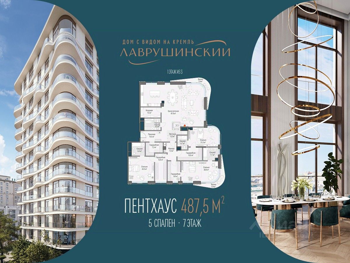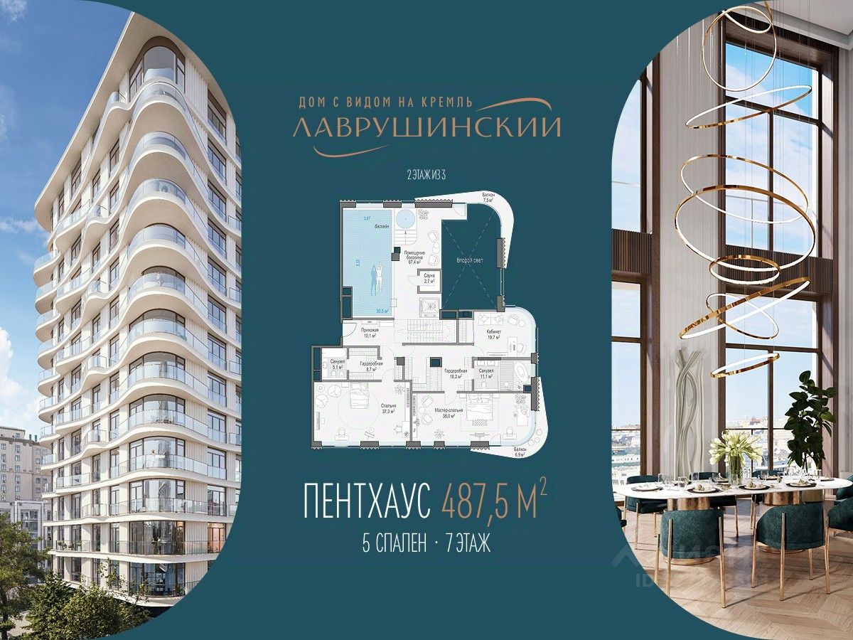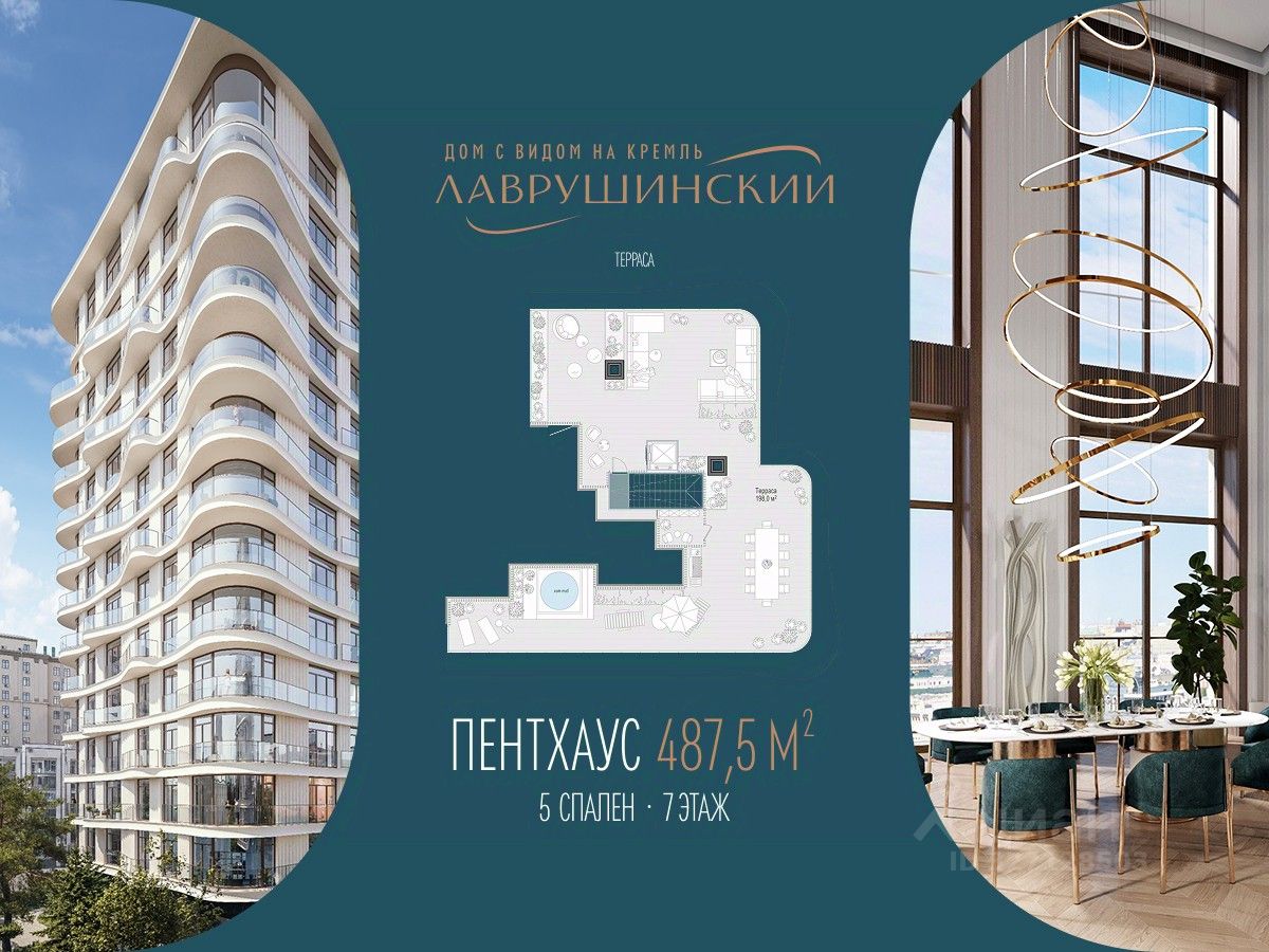 Двухэтажный пентхаус площадью 488 м² с террасой , бассейном и прямыми видами на Кремль, расположенный на 7-8 этажах центрального корпуса дома ''Лаврушинский''. • Прямые виды на Кремль, храм Христа Спасителя и исторический центр Москвы • Двухэтажная планировка • Площадь пентхауса - 488 м² • Площадь террасы - 198 м² • Второй свет: высота потолков - 8,2 м² • Возможность размещения до шести спален • Кухня-гостиная с дровяным камином • Возможность организации персонального бассейна с зоной спа и выходом на балкон О пентхаусе в доме ''Лаврушинский'' Пространство пентхауса выстроено так, чтобы естественно подстраиваться под ваш ритм жизни. Планировка позволяет гибко организовать жилые сценарии и спланировать индивидуальные гардеробные и ванные комнаты для спален, сохраняя комфорт и приватность. В гостиной можно установить дровяной камин, создающий уютную атмосферу загородного пространства. Просторные террасы пентхаусов дарят ощущение полёта над городом. Они созданы, чтобы встречать здесь рассветы, устраивать тихие ужины или яркие вечеринки с потрясающими видами. Здесь хватит места для барбекю, летней кухни, уютной зоны отдыха, занятий спортом на открытом воздухе или собственного сада. Вы можете разместить на террасе хот-таб - собственное спа под открытым небом, чтобы расслабиться после деловой встречи или тренировки, полюбоваться рассветом и устроить свидание с видом на город.. Жителям доступна вся инфраструктура и премиальные сервисы дома ''Лаврушинский'', включая Clubhouse: фитнес с 25-метровым бассейном и спа, пространства для отдыха и продуманную детскую инфраструктуру, в одном километре от Кремля, в глубине собственного двора-парка площадью 1,4 гектара. Пространство для жизни без компромиссов и ограничений - с общей площадью 686 м², включая террасу. Девелопер проекта Sminex - лидер на рынке премиальных и элитных домов Москвы. С 2001 года построили более 100 проектов площадью 12 млн м² - покупатели выбирают у нас каждую третью квартиру в этом сегменте.