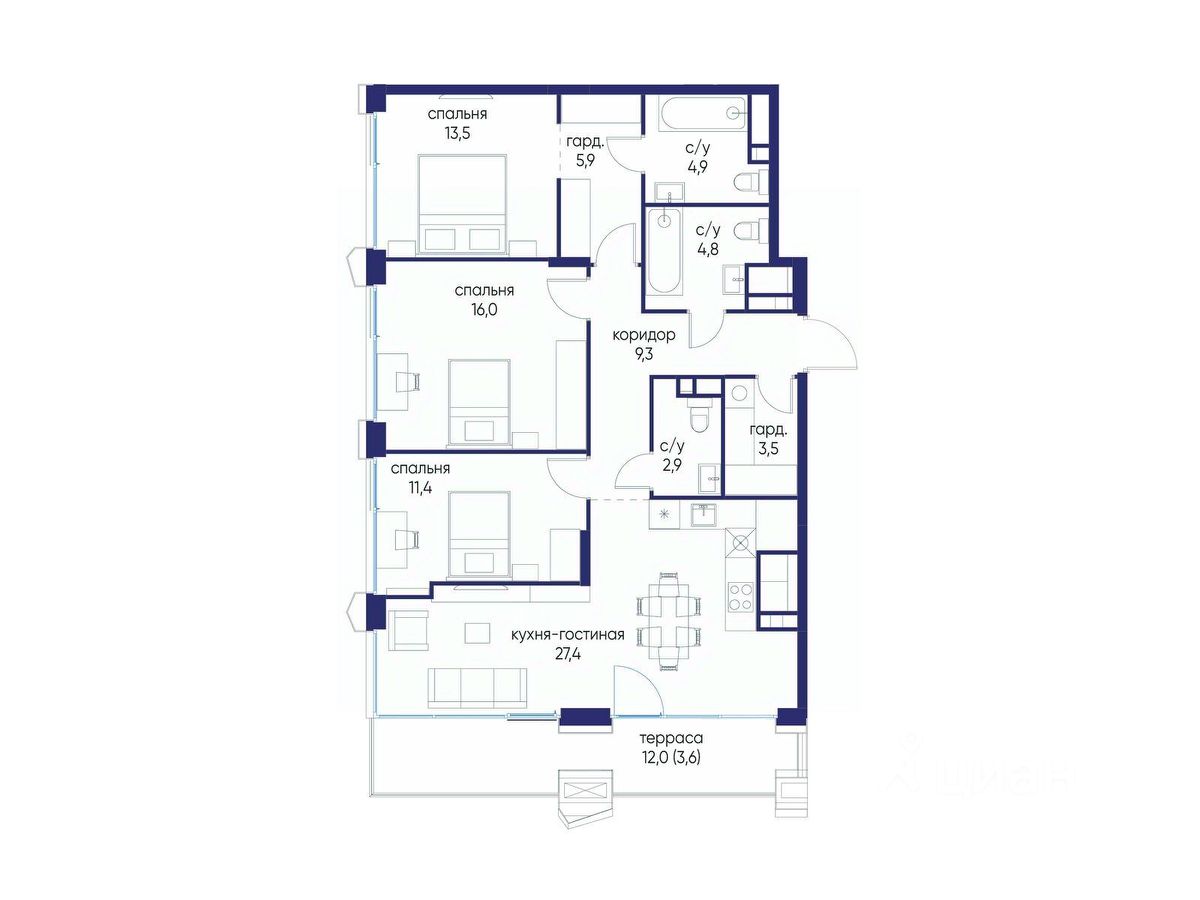 Продаётся многокомнатная квартира от застройщика: общая площадь 180.80 м², жилая 59.90 м², кухня 59.10 м², 3, жилой квартал ''Остров 7'', корпус 5 (7 квартал) (секция 1). срок сдачи: 4-кв. 2025. , 3 санузла: 1 раздельный и 2 совмещенных. В жилой зоне 2 больших окна на одну сторону, хорошая инсоляция. Позвоните сейчас и забронируйте квартиру! Купите квартиру в доме у прибрежного парка, в квартале ОСТРОВ.7. Это семь корпусов премиум- и бизнес-класса в одном из лучших мест ОСТРОВА - между бульваром и парком, поблизости от реки. Стильные корпуса имеют узнаваемый вид благодаря бионической пластике фасадов, приподнятых над землей. Для жителей предусмотрены детский клуб, фитнес-рум, коворкинг, переговорные, лаунжи. На крышах устроены видовые общественные пространства с зонами для отдыха и спорта. Двор расположен на двух уровнях: нижний ландшафтный парк и верхняя городская терраса. ОСТРОВ.7 - часть жилого комплекса на западе Москвы, в 15 минутах езды от центра. Это настоящий заповедник посреди большого города, в окружении реки и 650 га заповедников. Здесь все необходимое находится по соседству: от детского сада до супермаркета, от фитнес-зала до серфинг-центра. На территории созданы все условия для отдыха и общения: клубная инфраструктура в домах и дворы-парки, набережные и променады, маршруты для спортсменов, детей и возрастных жителей. В нескольких минутах ходьбы расположена станция метро ''Терехово'' БКЛ. На автомобиле - 10 минут до Москва-Сити и 15 минут до Садового кольца.