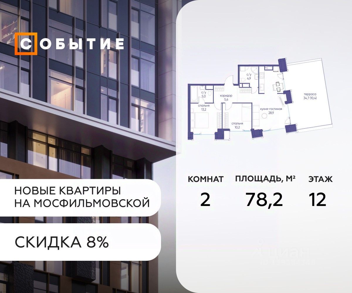 Около 10 минут до Москва Сити и ТТК! В продаже 2-к квартира от застройщика. Общая площадь 78.2, жилая 8.2, кухня 70. Квартира расположена на 12 этаже жилого квартала ''Событие-6'', корпус 2, Секция Секция 5. Квартира без отделки. Срок сдачи: 4 кв. 2029 года. СОБЫТИЕ.6 — финальный дом парк квартала СОБЫТИЕ на Мосфильмовской, созданный для тех, кто хочет ''заняться жизнью'' здесь и сейчас и получать максимум от каждого дня. Стильная архитектура, продуманное благоустройство и богатый набор общественных пространств делают дом естественной сценой для ярких личных событий. Архитектура от бюро Atrium на базе дизайн кода британских LDA Design и UHA London. Лучшая новостройка страны 2025 года! Расположение: • Около 710 минут пешком до станций метро ''Аминьевская'' и ''Мичуринский проспект'' (в зависимости от маршрута) • Около 15 минут до Садового кольца • Около 25 минут до аэропорта Внуково • Рядом — ключевые магистрали (Кутузовский, Мичуринский, Ломоносовский проспекты, Аминьевское шоссе), что упрощает выезды как в центр, так и за город Инфраструктура ''всё у дома'' Главный центр притяжения — модный парк ''Событие'' от бюро Wowhaus. Благоустроенный бульвар и рекреационные зоны занимают около половины территории квартала, а природная часть парка площадью более 12 гектаров уже открыта. В парке проложены: • примерно 1,5 км беговых дорожек • около 2,7 км велодорожек • около 1,6 км экотропы • детские и спортивные площадки, места для пикника, лекторий, декоративный огород, восстановленные биотопы • Парк ''Событие'' — финалист конкурса Правительства Москвы в номинации ''Строительство парков и общественных пространств'' Мультидвор Двор СОБЫТИЯ.6 — это мультимодальное пространство для жителей всех возрастов. Здесь предусмотрены: • игровые и развивающие площадки для малышей и детей постарше • воркаут зоны, площадки для игр с мячом и йоги для активных взрослых • мини бульвар с фонтаном для прогулок • террасы, амфитеатры и лаунжи для спокойного отдыха и встреч • Комьюнити террасы и общественные пространства на кровле 10 этажа Внутри дома предусмотрен полный набор общественных пространств: • детская игровая комната и детский клуб • спортрум / фитнес рум • коворкинг и комнаты для занятий с репетитором • дизайнерские лаунж зоны для деловых и личных встреч Район и окружение: парки, университеты, спорт Район относится к числу самых экологичных в Москве: он буквально утопает в зелени парков и заповедников. В окружении — парк ''Событие'', природный заказник ''Долина реки Раменки'', Воробьевы горы, Матвеевский лес, парк 50 летия Октября, парк Олимпийской деревни, Вороновский парк, набережные Москвы реки, заказник ''Долина реки Сетунь''. Это настоящая ''интеллектуальная миля'' Москвы: рядом МГУ имени М. В. Ломоносова, ботанический сад МГУ, театр им. Н. И. Сац, Новодевичий монастырь, стадион ''Лужники'', Парк Победы и другие знаковые объекты. Район особенно комфортен для сторонников ЗОЖ: множество мест для бега, велопрогулок, спорта на открытом воздухе и за