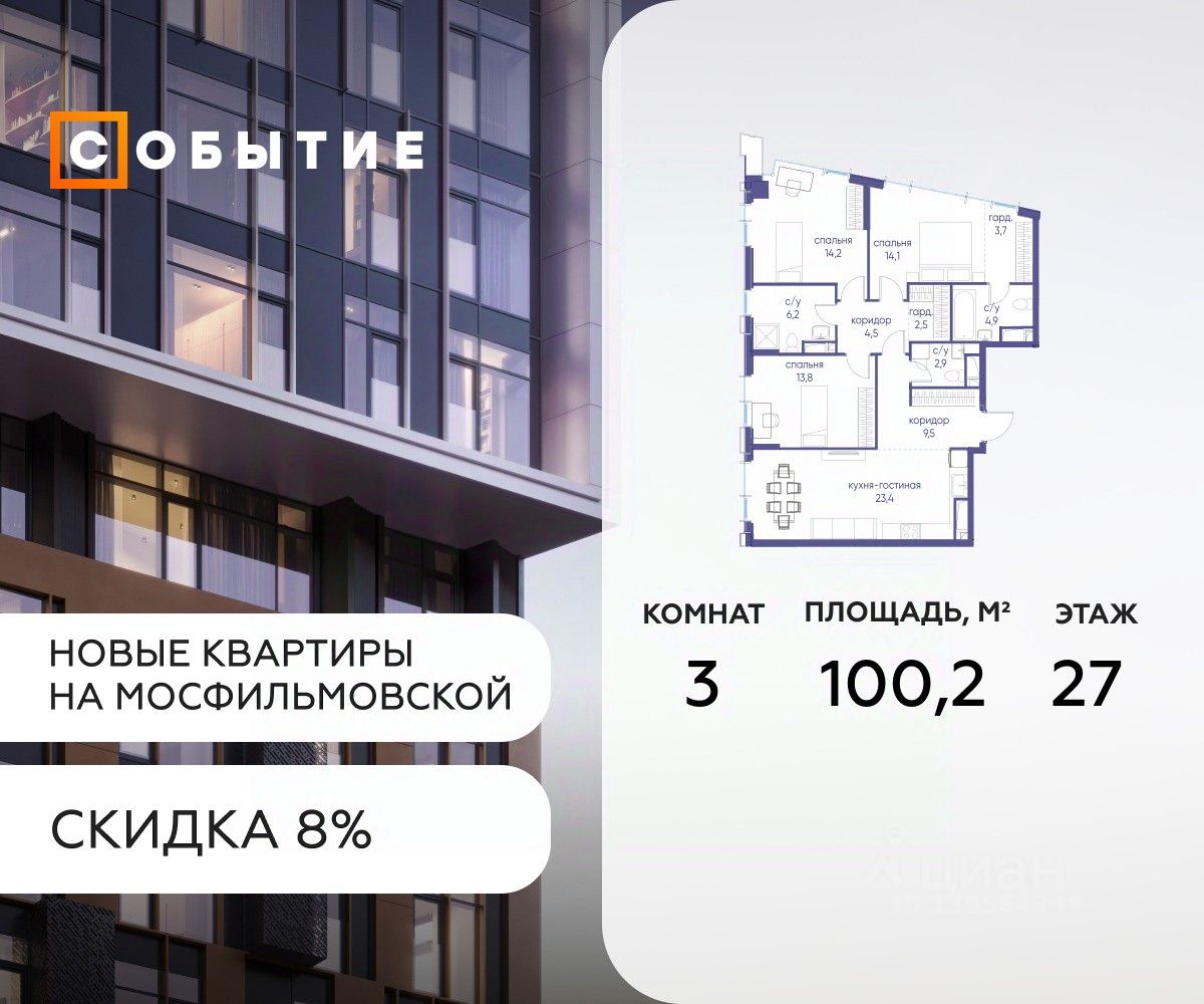 Около 10 минут до Москва Сити и ТТК! В продаже 3-к квартира от застройщика. Общая площадь 100.2, жилая 22.8, кухня 77.4. Квартира расположена на 27 этаже жилого квартала ''Событие-6'', корпус 2, Секция Секция 1. Квартира без отделки. Срок сдачи: 4 кв. 2029 года. СОБЫТИЕ.6 — финальный дом парк квартала СОБЫТИЕ на Мосфильмовской, созданный для тех, кто хочет ''заняться жизнью'' здесь и сейчас и получать максимум от каждого дня. Стильная архитектура, продуманное благоустройство и богатый набор общественных пространств делают дом естественной сценой для ярких личных событий. Архитектура от бюро Atrium на базе дизайн кода британских LDA Design и UHA London. Лучшая новостройка страны 2025 года! Расположение: • Около 710 минут пешком до станций метро ''Аминьевская'' и ''Мичуринский проспект'' (в зависимости от маршрута) • Около 15 минут до Садового кольца • Около 25 минут до аэропорта Внуково • Рядом — ключевые магистрали (Кутузовский, Мичуринский, Ломоносовский проспекты, Аминьевское шоссе), что упрощает выезды как в центр, так и за город Инфраструктура ''всё у дома'' Главный центр притяжения — модный парк ''Событие'' от бюро Wowhaus. Благоустроенный бульвар и рекреационные зоны занимают около половины территории квартала, а природная часть парка площадью более 12 гектаров уже открыта. В парке проложены: • примерно 1,5 км беговых дорожек • около 2,7 км велодорожек • около 1,6 км экотропы • детские и спортивные площадки, места для пикника, лекторий, декоративный огород, восстановленные биотопы • Парк ''Событие'' — финалист конкурса Правительства Москвы в номинации ''Строительство парков и общественных пространств'' Мультидвор Двор СОБЫТИЯ.6 — это мультимодальное пространство для жителей всех возрастов. Здесь предусмотрены: • игровые и развивающие площадки для малышей и детей постарше • воркаут зоны, площадки для игр с мячом и йоги для активных взрослых • мини бульвар с фонтаном для прогулок • террасы, амфитеатры и лаунжи для спокойного отдыха и встреч • Комьюнити террасы и общественные пространства на кровле 10 этажа Внутри дома предусмотрен полный набор общественных пространств: • детская игровая комната и детский клуб • спортрум / фитнес рум • коворкинг и комнаты для занятий с репетитором • дизайнерские лаунж зоны для деловых и личных встреч Район и окружение: парки, университеты, спорт Район относится к числу самых экологичных в Москве: он буквально утопает в зелени парков и заповедников. В окружении — парк ''Событие'', природный заказник ''Долина реки Раменки'', Воробьевы горы, Матвеевский лес, парк 50 летия Октября, парк Олимпийской деревни, Вороновский парк, набережные Москвы реки, заказник ''Долина реки Сетунь''. Это настоящая ''интеллектуальная миля'' Москвы: рядом МГУ имени М. В. Ломоносова, ботанический сад МГУ, театр им. Н. И. Сац, Новодевичий монастырь, стадион ''Лужники'', Парк Победы и другие знаковые объекты. Район особенно комфортен для сторонников ЗОЖ: множество мест для бега, велопрогулок, спорта на открытом воздухе