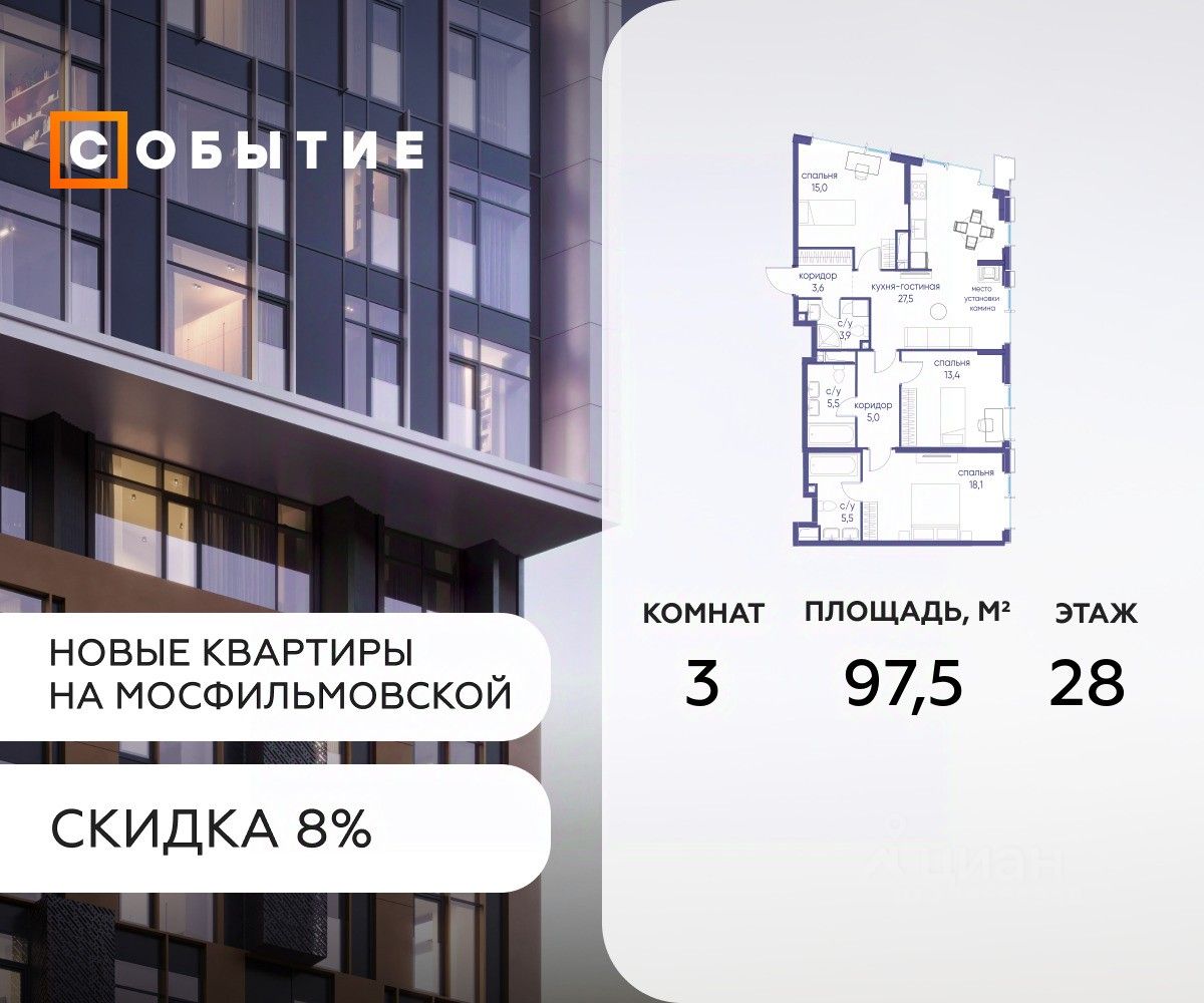 Около 10 минут до Москва Сити и ТТК! В продаже 3-к квартира от застройщика. Общая площадь 97.5, жилая 11.3, кухня 86.2. Квартира расположена на 28 этаже жилого квартала ''Событие-6'', корпус 2, Секция Секция 1. Квартира без отделки. Срок сдачи: 4 кв. 2029 года. СОБЫТИЕ.6 — финальный дом парк квартала СОБЫТИЕ на Мосфильмовской, созданный для тех, кто хочет ''заняться жизнью'' здесь и сейчас и получать максимум от каждого дня. Стильная архитектура, продуманное благоустройство и богатый набор общественных пространств делают дом естественной сценой для ярких личных событий. Архитектура от бюро Atrium на базе дизайн кода британских LDA Design и UHA London. Лучшая новостройка страны 2025 года! Расположение: • Около 710 минут пешком до станций метро ''Аминьевская'' и ''Мичуринский проспект'' (в зависимости от маршрута) • Около 15 минут до Садового кольца • Около 25 минут до аэропорта Внуково • Рядом — ключевые магистрали (Кутузовский, Мичуринский, Ломоносовский проспекты, Аминьевское шоссе), что упрощает выезды как в центр, так и за город Инфраструктура ''всё у дома'' Главный центр притяжения — модный парк ''Событие'' от бюро Wowhaus. Благоустроенный бульвар и рекреационные зоны занимают около половины территории квартала, а природная часть парка площадью более 12 гектаров уже открыта. В парке проложены: • примерно 1,5 км беговых дорожек • около 2,7 км велодорожек • около 1,6 км экотропы • детские и спортивные площадки, места для пикника, лекторий, декоративный огород, восстановленные биотопы • Парк ''Событие'' — финалист конкурса Правительства Москвы в номинации ''Строительство парков и общественных пространств'' Мультидвор Двор СОБЫТИЯ.6 — это мультимодальное пространство для жителей всех возрастов. Здесь предусмотрены: • игровые и развивающие площадки для малышей и детей постарше • воркаут зоны, площадки для игр с мячом и йоги для активных взрослых • мини бульвар с фонтаном для прогулок • террасы, амфитеатры и лаунжи для спокойного отдыха и встреч • Комьюнити террасы и общественные пространства на кровле 10 этажа Внутри дома предусмотрен полный набор общественных пространств: • детская игровая комната и детский клуб • спортрум / фитнес рум • коворкинг и комнаты для занятий с репетитором • дизайнерские лаунж зоны для деловых и личных встреч Район и окружение: парки, университеты, спорт Район относится к числу самых экологичных в Москве: он буквально утопает в зелени парков и заповедников. В окружении — парк ''Событие'', природный заказник ''Долина реки Раменки'', Воробьевы горы, Матвеевский лес, парк 50 летия Октября, парк Олимпийской деревни, Вороновский парк, набережные Москвы реки, заказник ''Долина реки Сетунь''. Это настоящая ''интеллектуальная миля'' Москвы: рядом МГУ имени М. В. Ломоносова, ботанический сад МГУ, театр им. Н. И. Сац, Новодевичий монастырь, стадион ''Лужники'', Парк Победы и другие знаковые объекты. Район особенно комфортен для сторонников ЗОЖ: множество мест для бега, велопрогулок, спорта на открытом воздухе и