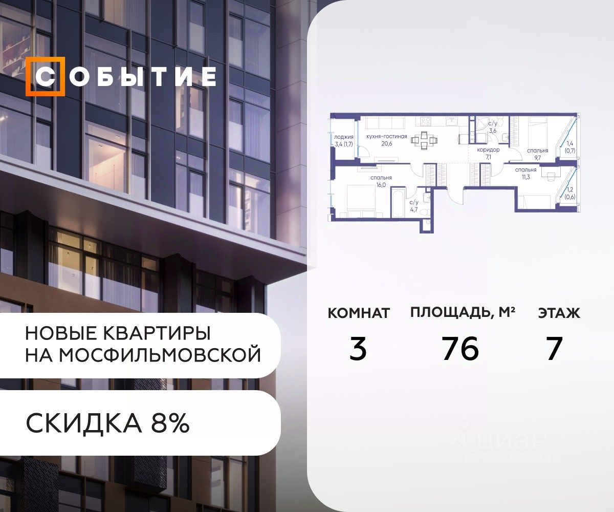 Около 10 минут до Москва Сити и ТТК! В продаже 3-к квартира от застройщика. Общая площадь 76, жилая 20.9, кухня 55.1. Квартира расположена на 7 этаже жилого квартала ''Событие-6'', корпус 2, Секция Секция 4. Квартира без отделки. Срок сдачи: 4 кв. 2029 года. СОБЫТИЕ.6 — финальный дом парк квартала СОБЫТИЕ на Мосфильмовской, созданный для тех, кто хочет ''заняться жизнью'' здесь и сейчас и получать максимум от каждого дня. Стильная архитектура, продуманное благоустройство и богатый набор общественных пространств делают дом естественной сценой для ярких личных событий. Архитектура от бюро Atrium на базе дизайн кода британских LDA Design и UHA London. Лучшая новостройка страны 2025 года! Расположение: • Около 710 минут пешком до станций метро ''Аминьевская'' и ''Мичуринский проспект'' (в зависимости от маршрута) • Около 15 минут до Садового кольца • Около 25 минут до аэропорта Внуково • Рядом — ключевые магистрали (Кутузовский, Мичуринский, Ломоносовский проспекты, Аминьевское шоссе), что упрощает выезды как в центр, так и за город Инфраструктура ''всё у дома'' Главный центр притяжения — модный парк ''Событие'' от бюро Wowhaus. Благоустроенный бульвар и рекреационные зоны занимают около половины территории квартала, а природная часть парка площадью более 12 гектаров уже открыта. В парке проложены: • примерно 1,5 км беговых дорожек • около 2,7 км велодорожек • около 1,6 км экотропы • детские и спортивные площадки, места для пикника, лекторий, декоративный огород, восстановленные биотопы • Парк ''Событие'' — финалист конкурса Правительства Москвы в номинации ''Строительство парков и общественных пространств'' Мультидвор Двор СОБЫТИЯ.6 — это мультимодальное пространство для жителей всех возрастов. Здесь предусмотрены: • игровые и развивающие площадки для малышей и детей постарше • воркаут зоны, площадки для игр с мячом и йоги для активных взрослых • мини бульвар с фонтаном для прогулок • террасы, амфитеатры и лаунжи для спокойного отдыха и встреч • Комьюнити террасы и общественные пространства на кровле 10 этажа Внутри дома предусмотрен полный набор общественных пространств: • детская игровая комната и детский клуб • спортрум / фитнес рум • коворкинг и комнаты для занятий с репетитором • дизайнерские лаунж зоны для деловых и личных встреч Район и окружение: парки, университеты, спорт Район относится к числу самых экологичных в Москве: он буквально утопает в зелени парков и заповедников. В окружении — парк ''Событие'', природный заказник ''Долина реки Раменки'', Воробьевы горы, Матвеевский лес, парк 50 летия Октября, парк Олимпийской деревни, Вороновский парк, набережные Москвы реки, заказник ''Долина реки Сетунь''. Это настоящая ''интеллектуальная миля'' Москвы: рядом МГУ имени М. В. Ломоносова, ботанический сад МГУ, театр им. Н. И. Сац, Новодевичий монастырь, стадион ''Лужники'', Парк Победы и другие знаковые объекты. Район особенно комфортен для сторонников ЗОЖ: множество мест для бега, велопрогулок, спорта на открытом воздухе и за