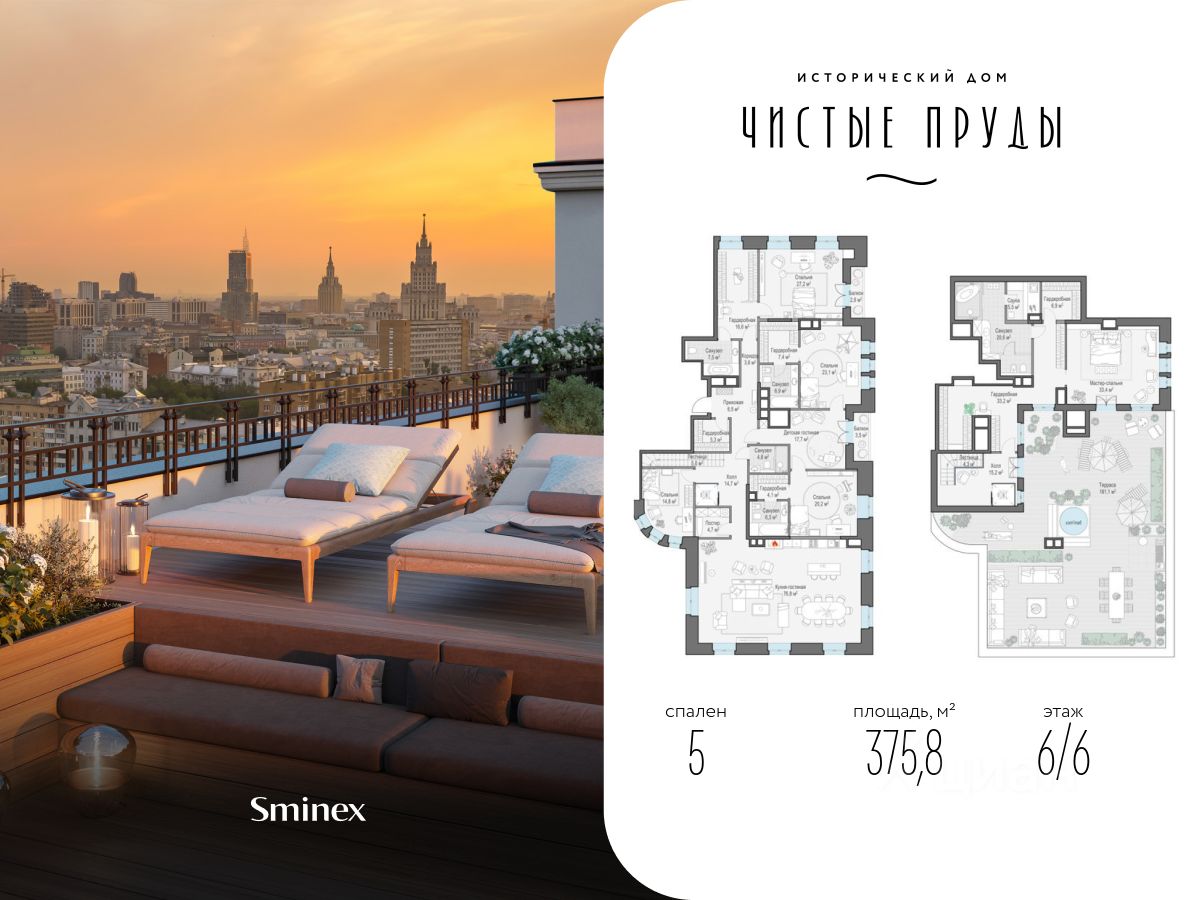 Роскошный пентхаус общей площадью 375,8 кв. м. расположен на 6-м этаже. Арочные окна, элегантный сферический эркер и высокие 4-метровые потолки создают уникальное пространство, наполненное светом. Продуманная и изысканная планировка, в которой разделены общие и приватные зоны позволит всем членам семьи совмещать свои сценарии жизни. Окна пентхауса выходят на все стороны света, дровяной камин в гостиной наполнит зимние вечера теплом и уютом, подчеркнет престиж и статус семьи. Потрескивание дров создает спокойную и романтичную атмосферу в доме. Расположенная на крыше личная терраса площадью 188 кв. м. с неповторимыми видами делает пентхаус идеальным местом для комфортной и по-настоящему роскошной жизни. ''Чистые Пруды'' - исторический дом на 34 квартиры в уникальном атмосферном районе Москвы, в 50 метрах от Чистых прудов. Это одно из самых романтичных и престижных мест столицы. Дом расположен в глубине квартала, в окружении тихих переулков - в полной тишине и приватности старого московского двора. ''Чистые Пруды'' - деликатно реконструированный исторический дом с изысканной архитектурой начала прошлого века авторства барона Отто фон Дессина. У дома максимально сохранены архитектурные формы 1915 года и подлинные кирпичные стены. В ''Чистых Прудах'' создана небывалая для таких домов инфраструктура. Только для жителей на месте каретного двора XIX века расположен Clubhouse с пространствами для общения соседей, здорового образа жизни и развития детей. В Lounge выделены каминная, патио, зона для проведения мастер-классов и настольных игр. Работает бесплатный фитнес по стандарту Fit Lab с зонами кардио, силовых тренажёров, свободных весов и функционального тренинга. Для детей в Clubhouse создана игровая комната по стандарту Kid's Lab. Есть свой всесезонный двор-сад. В доме представлены роскошные квартиры с дровяными каминами и высокими потолками от 3,9 до 5,4 м. О жителях и доме заботится Служба комфорта Smineх, которая предлагает сервис уровня 5-звёздочных отелей и сохраняет изначальный облик и концепцию дома. Девелопер проекта - Sminex. Компания обладает 23-летним опытом строительства жилой и коммерческой недвижимости. В 2022 году Sminex приобрёл девелопера ''Интеко'', в 2024 году - ''Инград''. Сегодня Sminex - девелопер N1 элитной и премиальной недвижимости, который создаёт комфортную и престижную среду.