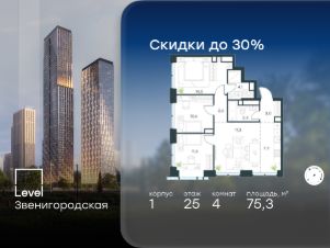 Цена указана с учётом скидки при 100%-й оплате, несубсидированной ипотеке, рассрочке (кроме программы ''Рассрочка 0%'').В жилом квартале продаётся 4-комнатная квартира площадью 75.30 кв.м white box. Квартира расположена на 25 этаже 48 этажного корпуса 1 в жилом комплексе комфорт класса Левел Звенигородская (компания Левел Group/Левел групп). Отличная транспортная доступность- 5 мин. пешком до метро ''Звенигородская'' (откроется к окончанию строительства),- 18 мин. пешком до станции МЦК ''Хорошёво'' и станции БКЛ ''Народное ополчение'',- 4 мин. на авто до ТТК,- 8 мин. на авто до Садового кольца,- 15 мин. на авто до Кремля. Продуманный архитектурный проект- Концепция от студии Станислава Михаловского, в основу которой легло единение природы и города,- Двухкамерные стеклопакеты в окнах, алюминиевый и ПВХ профиль - в квартирах тепло зимой и прохладно летом,- С верхних этажей откроются панорамные виды на город, Москву-реку, ''Москва-Сити'' и Москворецкий парк,- Лобби со всеми удобствами: окна в пол, высокие потолки до 4,7 м, лаунж-зоны, колясочные, гостевые санузлы и мойки для лап животных,- Централизованные водонагреватели гарантируют круглогодичную подачу горячей воды в каждую квартиру. БлагоустройствоКонцепция благоустройства разработана совместно с бюро UNK landscape. Высота башен приближается к 200 метрам - они словно касаются неба. Небесный простор проецируется на территорию двора с помощью подсветки, визуально увеличивая пространство и отражаясь в авторских элементах архитектуры.На территории площадью 0,45 га расположатся:- ''Облако событий'' - место встреч и общения,- ''Облако спорта'' - всё для поддержания себя в форме,- ''Облако принятия решений'' - пространство для работы на свежем воздухе,- ''Облако спокойствия'' - для отдыха в тишине природы,- ''Облако игр'' - площадки для подростков и самых маленьких. ИнфраструктураВ жилом комплексе откроется 21 коммерческое помещение: продуктовые лавки, кафе, салоны красоты, службы доставки и творческие студии.Этап 1 включает строительство двухуровневого подземного паркинга. Всего здесь расположится 351 машино-место, включая семейные места, и 264 кладовых помещения.В распоряжении жителей развитая инфраструктура района: 15 супермаркетов, 5 спортивных объектов, 9 медучреждений, 7 детских садов, 4 школы, 3 благоустроенных парка - всё в шаговой доступности. ИнженерияКомфортное перемещение внутри домов будут обеспечивать надёжные лифты с доступом в паркинг с жилых этажей. В каждом корпусе предусмотрено до шести кабин, включая сервисные лифты.Попасть на территорию комплекса можно только по единому ключу доступа. Видеонаблюдение установлено на входах в подъезды, в лобби, в общих зонах, на въезде в паркинг. Гости смогут связаться с жителями дома через входные видеопанели, а управлять доступом на территорию можно через видеодомофон или приложение на телефоне.
