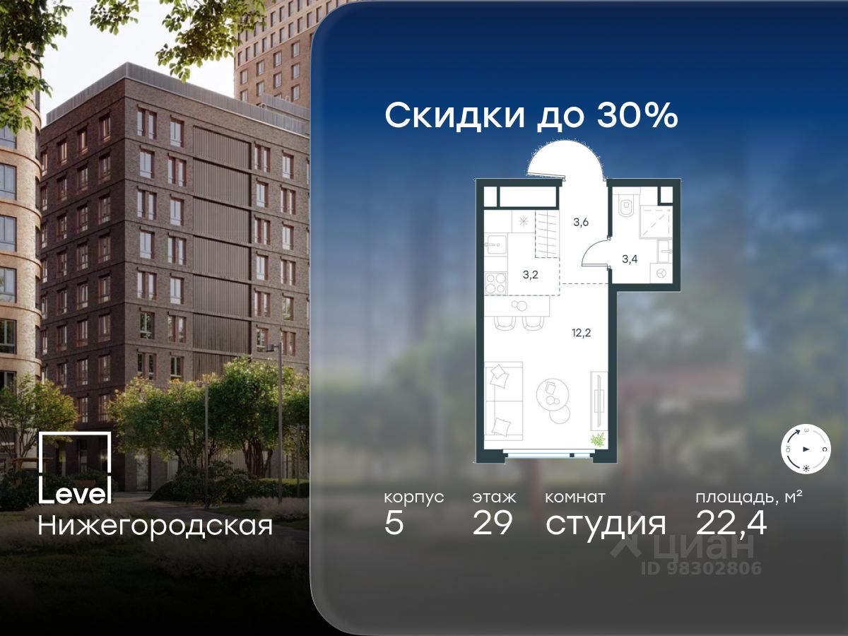 Цена указана с учётом скидки при 100%-й оплате, несубсидированной ипотеке, рассрочке (кроме программы ''Рассрочка 0%''). В активно развивающемся районе на юго-востоке столицы продается 3-комнатная квартира площадью 64,2 кв.м без отделки.. Квартира расположена на 40 этаже 45-этажного этажного корпуса 1 в жилом комплексе комфорт-класса Левел Нижегородская (компания Левел Group/Левел групп). Отличная транспортная доступность - 10 мин. пешком до станции метро, МЦД-4, БКЛ и МЦК ''Нижегородская'', - 13 мин. пешком до станций метро ''Андроновка'' и ''Перово'', - 10 мин. на авто до ТТК, - 14 мин. на авто до Садового кольца. Благоустройство Благоустроенная территория комплекса делится на внешнюю и внутреннюю. Внутренняя часть - это закрытый двор 0,9 га, где обустраиваются детские площадки для разных возрастных групп, беседки для отдыха и работы, несколько спортивных зон, включая воркаут-зоны и лужайку для бадминтона. Здесь же появится ухоженный луг с прогулочными маршрутами. Рядом с жилым комплексом будет создан ландшафтный парк площадью 2,4 га. В парке будут высажены высокие деревья, луговые травы и кустарники, благоустроены лаунж-зоны у пруда, дорожки для бега и прогулок. В центре парка предусмотрена событийная площадь, рядом расположатся дополнительные спортивные и детские площадки, а также зона для выгула домашних питомцев. Внутренняя инфраструктура Дома жилого комплекса будут оснащены коммерческими помещениями, где откроются все необходимые сервисы: магазины, аптеки, салоны красоты, кофейни, службы доставки и многое другое. Комфорт - это когда всё рядом. Кроме того, на территории Левел Нижегородская предусмотрен подземный отапливаемый паркинг. Этап 1 включает 335 машино-мест и 143 кладовых помещения для хранения сезонных вещей. Технологии и безопасность На территории всех общественных зон постоянно ведется видеонаблюдение и предусмотрен высокоскоростной Wi-Fi. Подъезды, паркинг и внутренний двор оснащены системой контроля доступа. Для удобства жителей создано мобильное приложение, позволяющее связаться с управляющей компанией, осуществлять удаленное управление видеодомофоном или просмотреть изображение отдельных видеокамер по заявке. Для безопасного перемещения по этажам и комфортного спуска в паркинг будут установлены современные лифты от компании BLT Brilliant Elevator. Скорость лифтов - 1,6 - 2,5 м/с. Особенности - Архитектура от экспертов из бюро ARCH(E)TYPE, - Разноуровневая застройка - от секций средней этажности до высоток в 45 этажей (этап 1), - Окна шириной до 2,2 метров (этап1) с видами на Останкинскую башню, Измайловский парк, ''Москва-Сити'' и Кусковский лесопарк, - Лобби с окнами в пол и потолками от 3,4 метров, оснащенные консьерж-сервисом, - Более 35 видов планировок, включая редкие форматы. Артикул 1-464.