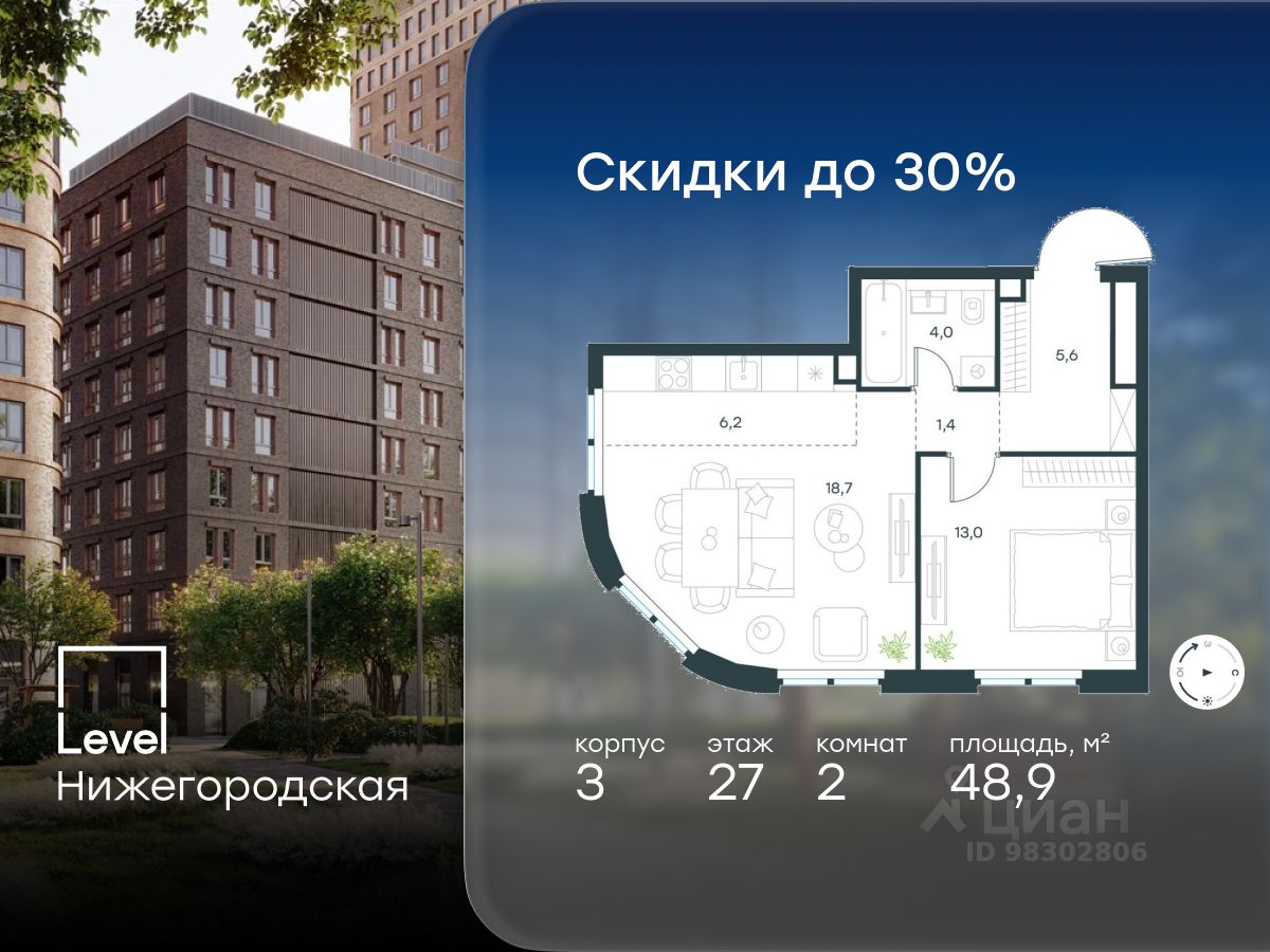 Цена указана с учётом скидки при 100%-й оплате, несубсидированной ипотеке, рассрочке (кроме программы ''Рассрочка 0%''). В активно развивающемся районе на юго-востоке столицы продается 2-комнатная квартира площадью 48,8 кв.м без отделки.. Квартира расположена на 30 этаже 37-этажного этажного корпуса 3 в жилом комплексе комфорт-класса Левел Нижегородская (компания Левел Group/Левел групп). Отличная транспортная доступность - 10 мин. пешком до станции метро, МЦД-4, БКЛ и МЦК ''Нижегородская'', - 13 мин. пешком до станций метро ''Андроновка'' и ''Перово'', - 10 мин. на авто до ТТК, - 14 мин. на авто до Садового кольца. Благоустройство Благоустроенная территория комплекса делится на внешнюю и внутреннюю. Внутренняя часть - это закрытый двор 0,9 га, где обустраиваются детские площадки для разных возрастных групп, беседки для отдыха и работы, несколько спортивных зон, включая воркаут-зоны и лужайку для бадминтона. Здесь же появится ухоженный луг с прогулочными маршрутами. Рядом с жилым комплексом будет создан ландшафтный парк площадью 2,4 га. В парке будут высажены высокие деревья, луговые травы и кустарники, благоустроены лаунж-зоны у пруда, дорожки для бега и прогулок. В центре парка предусмотрена событийная площадь, рядом расположатся дополнительные спортивные и детские площадки, а также зона для выгула домашних питомцев. Внутренняя инфраструктура Дома жилого комплекса будут оснащены коммерческими помещениями, где откроются все необходимые сервисы: магазины, аптеки, салоны красоты, кофейни, службы доставки и многое другое. Комфорт - это когда всё рядом. Кроме того, на территории Левел Нижегородская предусмотрен подземный отапливаемый паркинг. Этап 1 включает 335 машино-мест и 143 кладовых помещения для хранения сезонных вещей. Технологии и безопасность На территории всех общественных зон постоянно ведется видеонаблюдение и предусмотрен высокоскоростной Wi-Fi. Подъезды, паркинг и внутренний двор оснащены системой контроля доступа. Для удобства жителей создано мобильное приложение, позволяющее связаться с управляющей компанией, осуществлять удаленное управление видеодомофоном или просмотреть изображение отдельных видеокамер по заявке. Для безопасного перемещения по этажам и комфортного спуска в паркинг будут установлены современные лифты от компании BLT Brilliant Elevator. Скорость лифтов - 1,6 - 2,5 м/с. Особенности - Архитектура от экспертов из бюро ARCH(E)TYPE, - Разноуровневая застройка - от секций средней этажности до высоток в 45 этажей (этап 1), - Окна шириной до 2,2 метров (этап1) с видами на Останкинскую башню, Измайловский парк, ''Москва-Сити'' и Кусковский лесопарк, - Лобби с окнами в пол и потолками от 3,4 метров, оснащенные консьерж-сервисом, - Более 35 видов планировок, включая редкие форматы. Артикул 3-347.