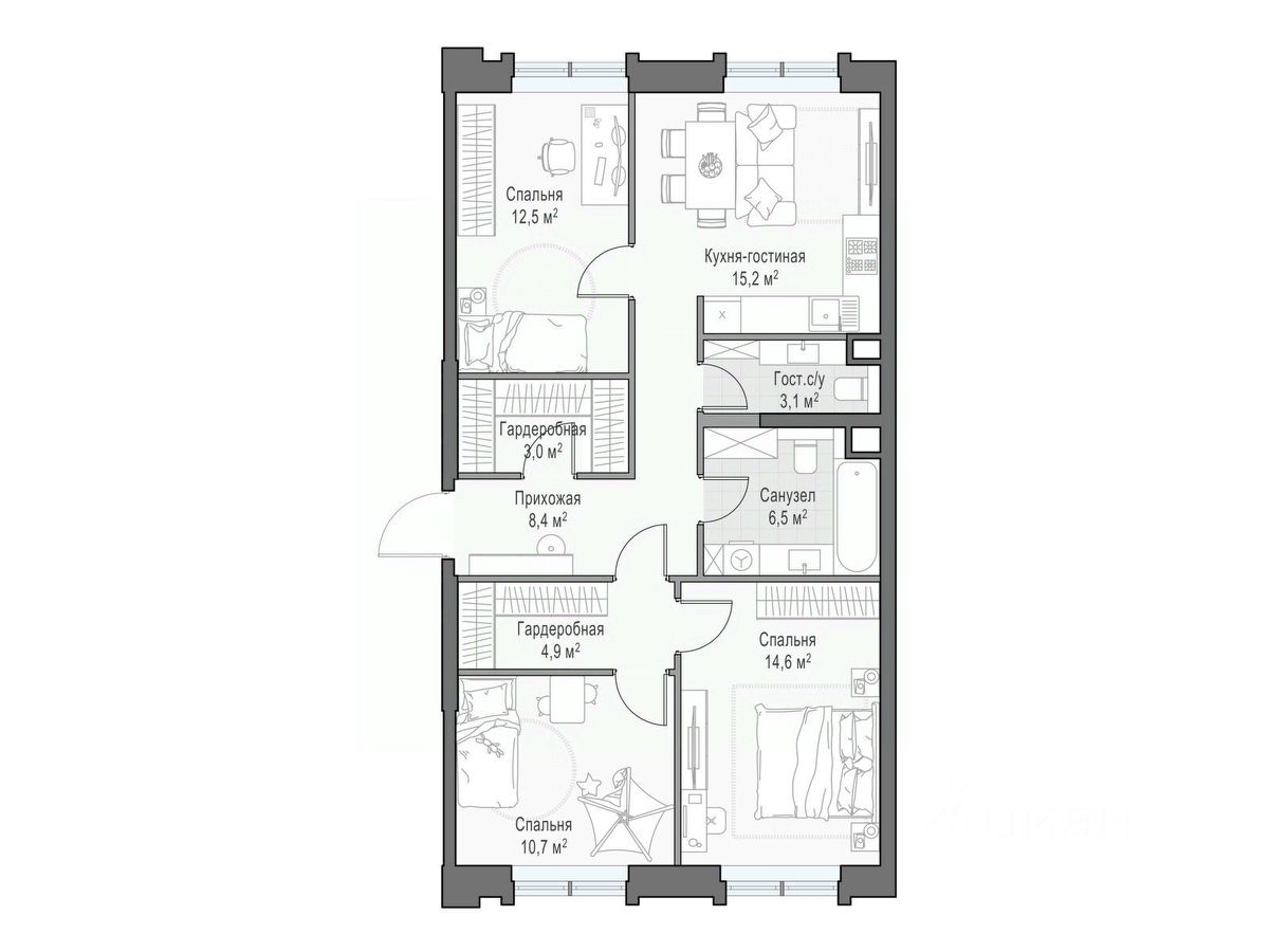 Трёхспальная квартира с двумя балконами. Просторная кухня-гостиная c видом на Останкинскую телебашню. Окна двух спален выходят на ландшафтный двор-парк. ''Достижение'' - единственный дом с торжественной архитектурой в окружении бескрайних парков на любой вкус: парк ''Дубовая роща'', обновленный классический парк ''Останкино'', самый известный парк России ВДНХ и крупнейший в Европе ботанический сад. Дом находится в непосредственной близости от центра города: до Садового кольца на автомобиле - 15 минут, 700 м до станции метро ''Бутырская'', а от нее всего 3 станции на метро - и вы на Цветном бульваре. Архитектура проекта - современное прочтение торжественного и изящного стиля ар-деко, который, как и сталинский ампир, сформировался в результате развития идей чикагской школы. В доме 6 секций, 115 вариантов продуманных планировочных решений - от уютных студий до просторных пентхаусов с дровяным камином. В каждой квартире предусмотрен полный комплекс систем комфорта: принудительная центральная вентиляция с фильтрацией воздуха, очистка воды до уровня питьевой, круглогодичное горячее водоснабжение, быстрые бесшумные лифты, которые идут прямо в паркинг, продуманная подготовка под кондиционирование и другие технологические решения. В доме ''Достижение'' общественные пространства и квартира тоже гармонично дополняют друг друга, как части единого целого. Здесь есть инфраструктурный центр Clubhouse только для жителей, открывающий возможности для общения и детского развития: клубная гостиная жителей по стандарту Friend's Lab и детская игровая комната 250 кв.м. в концепции Kid's Lab. На площади 1,7 гектара создан живописный парк с террасным склоном, в котором растут луговые травы, кустарники и деревья. Пространство ландшафтного парка разделено на зоны для активного и спокойного отдыха с зелёными уголками для любителей тишины. Для спокойного отдыха: тихие места с беседками и шезлонгами, клубная гостиная в концепции Friend's Lab с открытой террасой и гамаками, зона для барбекю, смотровая галерея, уютный пруд, а также пять пеших маршрутов для променада. Для активного отдыха: универсальная многофункциональная спортивная площадка, отдельная зона для занятий workout и бесплатный фитнес-зал только для жителей по стандарту Fit Lab. В центральной части парка расположен амфитеатр со сценой для представлений и проведения мероприятий. Для гармоничного развития маленьких жителей - пространства по стандарту Kid's Lab для гармоничного развития детей всех возрастов: детская площадка, игровая комната, рельефная площадка для общения со сверстниками, где можно заниматься паркуром, танцевать и играть в настольный теннис.
