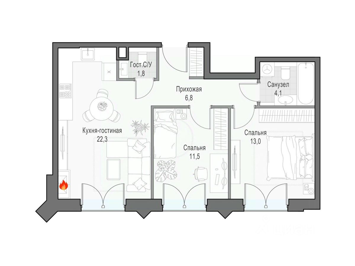 Двуспальная квартира с камином, просторной кухней-гостиной, двумя изолированными спальнями и двумя санузлами. Окна выходят на ландшафтный двор-парк. ''Достижение'' - единственный дом с торжественной архитектурой в окружении бескрайних парков на любой вкус: парк ''Дубовая роща'', обновленный классический парк ''Останкино'', самый известный парк России ВДНХ и крупнейший в Европе ботанический сад. Дом находится в непосредственной близости от центра города: до Садового кольца на автомобиле - 15 минут, 700 м до станции метро ''Бутырская'', а от нее всего 3 станции на метро - и вы на Цветном бульваре. Архитектура проекта - современное прочтение торжественного и изящного стиля ар-деко, который, как и сталинский ампир, сформировался в результате развития идей чикагской школы. В доме 6 секций, 115 вариантов продуманных планировочных решений - от уютных студий до просторных пентхаусов с дровяным камином. В каждой квартире предусмотрен полный комплекс систем комфорта: принудительная центральная вентиляция с фильтрацией воздуха, очистка воды до уровня питьевой, круглогодичное горячее водоснабжение, быстрые бесшумные лифты, которые идут прямо в паркинг, продуманная подготовка под кондиционирование и другие технологические решения. В доме ''Достижение'' общественные пространства и квартира тоже гармонично дополняют друг друга, как части единого целого. Здесь есть инфраструктурный центр Clubhouse только для жителей, открывающий возможности для общения и детского развития: клубная гостиная жителей по стандарту Friend's Lab и детская игровая комната 250 кв.м. в концепции Kid's Lab. На площади 1,7 гектара создан живописный парк с террасным склоном, в котором растут луговые травы, кустарники и деревья. Пространство ландшафтного парка разделено на зоны для активного и спокойного отдыха с зелёными уголками для любителей тишины. Для спокойного отдыха: тихие места с беседками и шезлонгами, клубная гостиная в концепции Friend's Lab с открытой террасой и гамаками, зона для барбекю, смотровая галерея, уютный пруд, а также пять пеших маршрутов для променада. Для активного отдыха: универсальная многофункциональная спортивная площадка, отдельная зона для занятий workout и бесплатный фитнес-зал только для жителей по стандарту Fit Lab. В центральной части парка расположен амфитеатр со сценой для представлений и проведения мероприятий. Для гармоничного развития маленьких жителей - пространства по стандарту Kid's Lab для гармоничного развития детей всех возрастов: детская площадка, игровая комната, рельефная площадка для общения со сверстниками, где можно заниматься паркуром, танцевать и играть в настольный теннис.