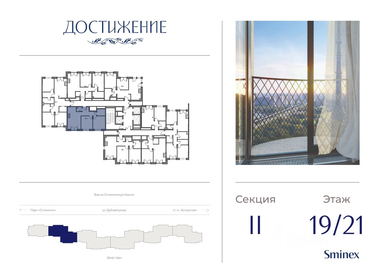 Квартира на две стороны света. Из окон открывается вид на променад и Останкинскую телебашню. Окна двух спален выходят с видом на двор-парк. ''Достижение'' - единственный дом с торжественной архитектурой в окружении бескрайних парков на любой вкус: парк ''Дубовая роща'', обновленный классический парк ''Останкино'', самый известный парк России ВДНХ и крупнейший в Европе ботанический сад. Дом находится в непосредственной близости от центра города: до Садового кольца на автомобиле - 15 минут, 700 м до станции метро ''Бутырская'', а от нее всего 3 станции на метро - и вы на Цветном бульваре. Архитектура проекта - современное прочтение торжественного и изящного стиля ар-деко, который, как и сталинский ампир, сформировался в результате развития идей чикагской школы. В доме 6 секций, 115 вариантов продуманных планировочных решений - от уютных студий до просторных пентхаусов с дровяным камином. В каждой квартире предусмотрен полный комплекс систем комфорта: принудительная центральная вентиляция с фильтрацией воздуха, очистка воды до уровня питьевой, круглогодичное горячее водоснабжение, быстрые бесшумные лифты, которые идут прямо в паркинг, продуманная подготовка под кондиционирование и другие технологические решения. В доме ''Достижение'' общественные пространства и квартира тоже гармонично дополняют друг друга, как части единого целого. Здесь есть инфраструктурный центр Clubhouse только для жителей, открывающий возможности для общения и детского развития: клубная гостиная жителей по стандарту Friend's Lab и детская игровая комната 250 кв.м. в концепции Kid's Lab. На площади 1,7 гектара создан живописный парк с террасным склоном, в котором растут луговые травы, кустарники и деревья. Пространство ландшафтного парка разделено на зоны для активного и спокойного отдыха с зелёными уголками для любителей тишины. Для спокойного отдыха: тихие места с беседками и шезлонгами, клубная гостиная в концепции Friend's Lab с открытой террасой и гамаками, зона для барбекю, смотровая галерея, уютный пруд, а также пять пеших маршрутов для променада. Для активного отдыха: универсальная многофункциональная спортивная площадка, отдельная зона для занятий workout и бесплатный фитнес-зал только для жителей по стандарту Fit Lab. В центральной части парка расположен амфитеатр со сценой для представлений и проведения мероприятий. Для гармоничного развития маленьких жителей - пространства по стандарту Kid's Lab для гармоничного развития детей всех возрастов: детская площадка, игровая комната, рельефная площадка для общения со сверстниками, где можно заниматься паркуром, танцевать и играть в настольный теннис.