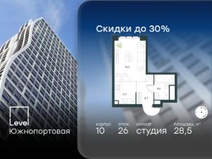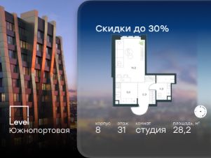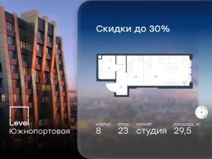 Цена указана с учётом скидки при 100%-й оплате, несубсидированной ипотеке, рассрочке (кроме программы ''Рассрочка 0%'').В северной части района Печатники продается студия площадью 28.50 кв.м без отделки. Квартира расположена на 29 этаже 68-этажного корпуса 10 в жилом комплексе комфорт-класса Level Южнопортовая (компания Level Group/Левел групп). Отличная транспортная доступность:- 10 мин. пешком до станции метро ''Кожуховская'',- 20 мин. пешком до станции МЦК ''Дубровка'',- 3 мин. на авто до ТТК,- 13 мин. на авто до Садового кольца,- 15 мин. на авто до Бульварного кольца. Продуманный архитектурный проект:- авторская архитектура от бюро СПИЧ,- уникальные виды на реку, парки и достопримечательности города,- высота потолков в квартирах до 6 м,- окна высотой до 1,87 м с высоким коэффициентом сопротивления теплоотдаче. Расположение:Level Южнопортовая строится в северной части района Печатники - самой приближенной к центру. Здесь будет сформирован новый район ''Южный порт'', где построят крупный жилой и общественно-деловой центр, аналогичный Москва-Сити. В течение 10-12 лет в этом месте появятся не только жилые дома, но и развитая инфраструктура для жизни и работы. А еще совсем рядом находится набережная Москвы-реки, где планируется построить причалы для речных трамвайчиков и канатную дорогу.Уже сейчас вокруг жилого комплекса работают десятки магазинов и торговых центров, рядом расположено 6 парков, среди которых музей-заповедник ''Коломенское''. В 10 минутах пешком - 2 муниципальных и 2 частных детских сада, 7 общеобразовательных школ.Внутренняя инфраструктура:Для отдыха жителей в каждом корпусе предусмотрено лобби, оснащенное местами для отдыха, гостевыми санузлами и лапомойками, а в отдельных корпусах - камином. За счёт больших окон и высоких потолков пространства будут наполнены воздухом и светом.На первых этажах жилого комплекса откроются магазины, салоны красоты, фитнес-центр. Для детей строятся собственные детский сад и школа. Благоустройство:Внутренний двор комплекса разработан совместно с бюро GAFA. Основная идея - создать аналог Центрального парка в Нью-Йорке, гармонично сочетая высотные здания и большое изолированное парковое пространство.Вся площадь двора-парка будет огорожена и составит более 2 га, из которых 45% - озеленение. Одним из самых важных ландшафтных элементов здесь станет небольшая речка, наполняющаяся во время дождя. Вокруг неё появится сеть из островов, внутри которых расположатся тематические зоны спорта и отдыха. Технологии и инженерия:- автоматическая передача в управляющую компанию показаний квартирных счётчиков,- телефонная связь, телевидение и интернет на базе оптической мультисервисной сети,- гостевой Wi-Fi в лобби и на территории двора,- единый ключ доступа для входа на территорию комплекса.