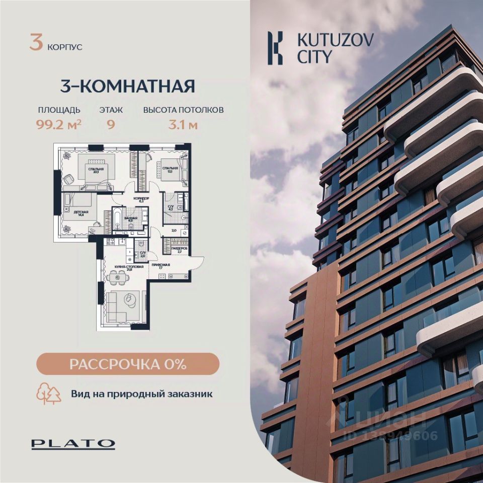 Продается простороная трехкомнатная квартира площадью 99,2 м² в корпусе ''Созидание'' клубного дома ''Кутузов Сити''. Функциональная планировка квартиры идеально подойдёт для семьи. В квартире три изолированные комнаты, одна из которых — мастер-спальня с санузлом и отдельным помещением, которое можно адаптировать под гардеробную или небольшой кабинет. Просторная кухня-гостиная станет идеальным местом для семейных ужинов и приёма гостей. В общей сложности, в квартире предусмотрено три санузла. Одно из этих помещений можно адаптировать под прачечную. В просторной прихожей предусмотрено место для хранения и отдельная кладовая. Большие окна во всей квартире наполняют комнаты естественным светом и делают солнце частью интерьера. Высокие потолки придают пространству ощущение свободы и лёгкости. Продуманная планировка позволяет эффективно использовать каждый квадратный метр. О проекте: ''Кутузов Сити'' — клубный дом на 220 квартир, разработанный совместно с бюро Atrium и Oleg Klodt Architecture & Design. Проект строится в престижном Западном административном округе Москвы, всего в нескольких минутах ходьбы от Кутузовского проспекта. Закрытая территория, приватный двор, подземный паркинг и стильные лобби создают атмосферу комфорта и безопасности. В двух шагах от дома находится крупнейшая природная территория Москвы — природный заказник ''Долина реки Сетунь''. Камерная застройка и развитая инфраструктура делают ''Кутузов Сити'' отличным выбором для тех, кто ценит качество жизни и близость к природе. (Лот: 125)