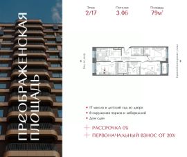 Рассрочка 0% с первоначальным взносом от 20% Квартира на 2 этаже в жилом комплексе премиум-класса ''Преображенская площадь''. Общая площадь: 79 кв.м. Проект премиум-класса в историческом районе Москвы. До метро ''Преображенская площадь'' 3 минуты пешком. Квартиры сдаются без отделки и в свободной планировке, чтобы жители могли оформить пространство с учетом своей индивидуальности. Высота потолков от 3,15м, широкоформатное остекление, 3-5 квартир на этаже. Система Умный дом. Дизайнерские лобби. Внутренний двор 1,5 га функциональное и безопасное пространство для игр, работы и занятий спортом. Пешеходный променад для прогулок. Дома переменной этажности. Есть подземный паркинг. Жилой комлекс находится в окружении парков Сокольники, Черкизовский, Измайловский, заповедника Лосиный остров и ВДНХ, а также вблизи пешеходной набережной. Комфортная удаленность от центра: 7 минут на автомобиле до ТТК, 8 минут до Садового кольца, 25 минут до Кремля.