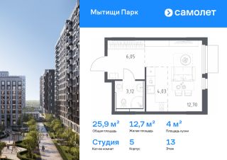 Предлагается квартира студия комфорт-класса 25,9 кв.м в корпусе 5 на 13 этаже, в ЖК ''Мытищи Парк''Квартира без отделки. Доступность опции ''отделка'' и возможность комплектации мебелью и декором уточняйте у застройщика.Приобрести квартиру возможно по специальным акциям от застройщика, с текущими условиями акций можно ознакомиться в блоке ''Акций''.Цена динамическая и может отличаться, уточняйте актуальность у застройщика.ЖК ''Мытищи Парк'' — это надежные и долговечные монолитные корпуса. При проектировании домов и территории застройщик учел потребности жильцов всех возрастов — молодых пар, семей с детьми и пожилых людей.ЖК ''Мытищи Парк'' расположен в Московской области и с двух сторон окружен Пироговским лесопарком.