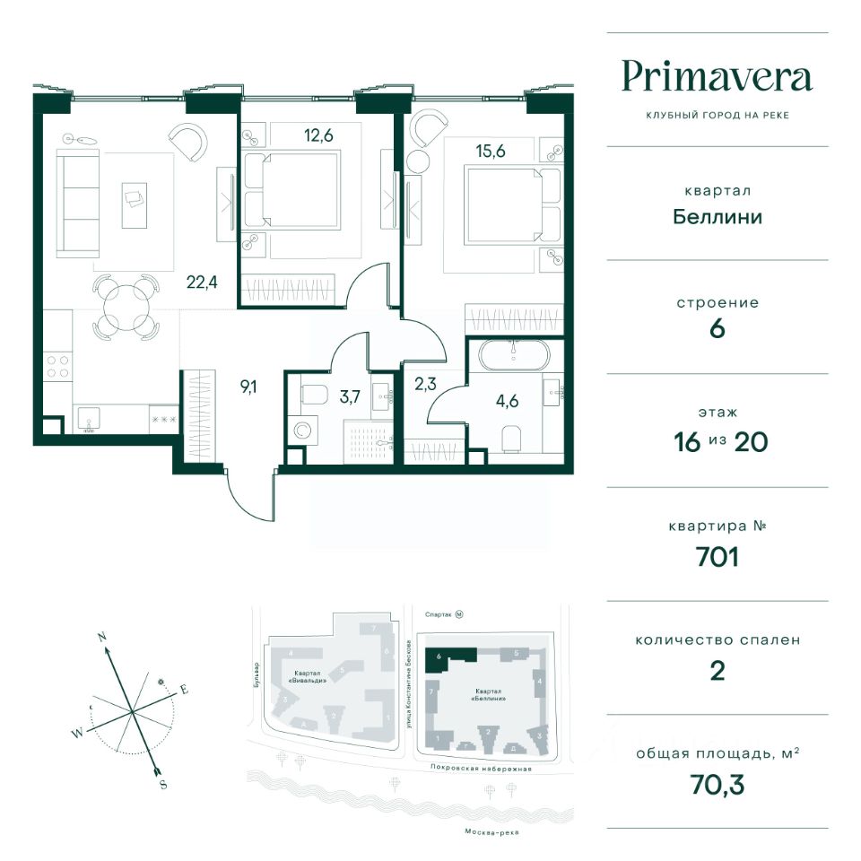 Клубный город на реке Primavera — это современный жилой комплекс премиум-класса, расположенный на первой береговой линии Москвы-реки в экологически чистом районе Покровское-Стрешнево. Под панорамными окнами квартир находится собственный экопарк с продуманной сетью прогулочных дорожек и современными детскими и спортивными площадками. За парком расположена набережная с собственным пляжем и зонами для отдыха. Клубный город на реке Primavera предлагает широкий выбор планировок для различных жизненных сценариев: от просторных однокомнатных квартир до пентхаусов и жилых помещений с террасами и патио. Выберите из 120 вариантов эргономичных планировок стандартного и евроформата. Из каждой квартиры открываются красивые виды на реку с углом обзора в 270 градусов. Дизайнерские лобби предлагают панорамный обзор на благоустроенный двор. Высокие потолки в 6 метров и качественная отделка создают атмосферу, схожую с пятизвездочными отелями. В Primavera есть всё необходимое для комфортной жизни в мегаполисе: •Образование для детей в шаговой доступности: 4 школы, 8 детских садов и развивающие центры с кружками и секциями. •Удобства на расстоянии приятной прогулки: супермаркеты, кафе, рестораны с верандами, салоны красоты, аптеки и многофункциональный центр для шоппинга и развлечений. •Умный дом: автоматизированное бесконтактное управление основными системами доступа и безопасности через мобильное приложение. Клубный город на реке Primavera выгодно сочетает комфорт городской жизни с близостью к природе. Живите в месте, где все создано для вашего удобства!