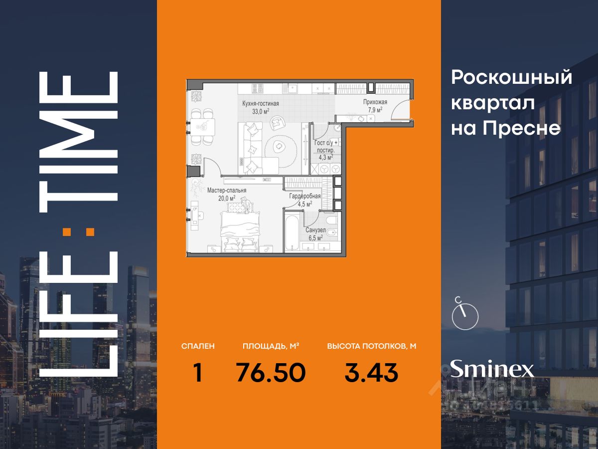 Просторная светлая квартира площадью 76,5 кв. м. Из кухни-гостиной (33 кв. м) открывается вид на цветущий двор-парк, а панорамное остекление улучшает видовые характеристики квартиры. Продуманная планировка позволяет разместить одну спальню с отдельным санузлом и гардеробом. Life Time - роскошный современный квартал на Пресне, в наиболее быстро растущем премиальном районе ЦАО. Его насыщенная инфраструктура и выгодное расположение дарят время для жизни. Вы больше не тратите его на дорогу или ожидание, при этом ни в чём себе не отказывая. На территории предусмотрено всё для комфортной жизни: • двор-парк площадью 1,8 гектара с прудом и фонтанами, • Clubhouse - инфраструктурный центр в отдельном здании с исчерпывающими возможностями для спорта, отдыха и досуга только для жителей, • спортивная инфраструктура на улице и в помещении, в том числе бассейн длиной 25 метров, хот-таб, хаммам, сауна, бьюти-зона, • клубная гостиная с террасой, • всё для развития и досуга детей любого возраста, в том числе детский сад и школа. Life Time находится в центре сложившегося премиального района, в окружении многочисленных парков. Удобная транспортная доступность и прямой выезд на Звенигородское шоссе позволяют без проблем добраться до Садового кольца и Москва-Сити. Архитектурный стиль квартала - роскошный минимализм. Дома десятилетиями будут выглядеть современно.