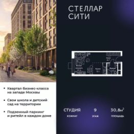 Продается квартира от надежного застройщика Tashir Estate в квартале бизнес-класса Stellar City в ЗАО Москвы. Площадь квартиры составляет: 30.8 кв. м, потолки: 3.1 м Квартира находится на 9 этаже, 4 корпуса жилого квартала Stellar City — микрогорода будущего на орбите Москвы. Stellar City — квартал в ЗАО Москвы вблизи инновационного центра Сколково. В окружении — 11 парков и природных зон, в том числе Долина реки Сетунь, Мещерский лес и парк развлечений The Rink. Город в городе Чтобы дом и инфраструктура вокруг отвечала динамичному лайфстайлу жителя мегаполиса, в основу проекта легла концепция город в городе, которая позволяет решать все бытовые вопросы in-home. В квартале будут возведены школа и детский сад, воркаут-зоны, променад, вело и беговые дорожки, детские площадки для каждого корпуса, а также коммерция на первых этажах для ежедневных покупок. Все необходимое — на расстоянии нескольких шагов. Изящные и лаконичные лобби Авторский дизайн, натуральные материалы в отделке и безупречный интерьер вне времени. Лобби и холлы в проекте бизнес-класса Stellar City ничем не отличаются от входных групп в премиум-сегменте благодаря качественным европейским материалам в отделке, стильному дизайну, консьерж-сервису и уютной зоне ожидания с журнальными столиками и мягкой мебелью. Комфорт и безопасность Закрытая территория, охрана, система СКУД, специально разработанное мобильное приложение дома для резидентов и подземный паркинг с круглосуточным наблюдением и доступом с помощью автоматического считывания номера авто.
