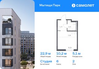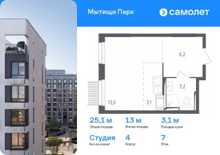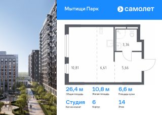 Предлагается квартира студия комфорт-класса 26,44 кв.м в корпусе 6 на 14 этаже, в ЖК ''Мытищи Парк''Квартира с предчистовой отделкой. Доступность дополнительных опций уточняйте у застройщика.Планировкой предусмотрены:Прихожая - 5,66 м²Кухня-ниша - 6,61 м²Студия - 10,81 м²СУ_1 - 3,36 м²Приобрести квартиру возможно по специальным акциям от застройщика, с текущими условиями акций можно ознакомиться в блоке Акций.Цена динамическая и может отличаться, уточняйте актуальность у застройщика.ЖК ''Мытищи Парк'' — это надежные и долговечные монолитные корпуса. При проектировании домов и территории застройщик учел потребности жильцов всех возрастов — молодых пар, семей с детьми и пожилых людей.ЖК ''Мытищи Парк'' расположен в Московской области и с двух сторон окружен Пироговским лесопарком.