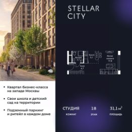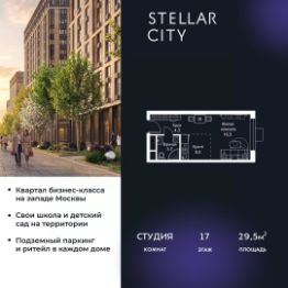 Продается квартира от надежного застройщика Tashir Estate в квартале бизнес-класса Stellar City в ЗАО Москвы. Площадь квартиры составляет: 29.5 кв. м, потолки: 3.1 м Квартира находится на 17 этаже, 4 корпуса жилого квартала Stellar City — микрогорода будущего на орбите Москвы. Stellar City — квартал в ЗАО Москвы вблизи инновационного центра Сколково. В окружении — 11 парков и природных зон, в том числе Долина реки Сетунь, Мещерский лес и парк развлечений The Rink. Город в городе Чтобы дом и инфраструктура вокруг отвечала динамичному лайфстайлу жителя мегаполиса, в основу проекта легла концепция город в городе, которая позволяет решать все бытовые вопросы in-home. В квартале будут возведены школа и детский сад, воркаут-зоны, променад, вело и беговые дорожки, детские площадки для каждого корпуса, а также коммерция на первых этажах для ежедневных покупок. Все необходимое — на расстоянии нескольких шагов. Изящные и лаконичные лобби Авторский дизайн, натуральные материалы в отделке и безупречный интерьер вне времени. Лобби и холлы в проекте бизнес-класса Stellar City ничем не отличаются от входных групп в премиум-сегменте благодаря качественным европейским материалам в отделке, стильному дизайну, консьерж-сервису и уютной зоне ожидания с журнальными столиками и мягкой мебелью. Комфорт и безопасность Закрытая территория, охрана, система СКУД, специально разработанное мобильное приложение дома для резидентов и подземный паркинг с круглосуточным наблюдением и доступом с помощью автоматического считывания номера авто.