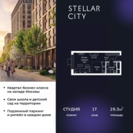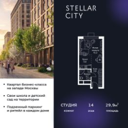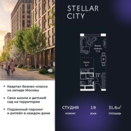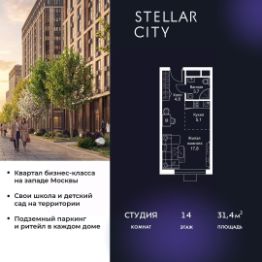 Продается квартира от надежного застройщика Tashir Estate в квартале бизнес-класса Stellar City в ЗАО Москвы. Площадь квартиры составляет: 31.4 кв. м, потолки: 3.1 м Квартира находится на 14 этаже, 4 корпуса жилого квартала Stellar City — микрогорода будущего на орбите Москвы. Stellar City — квартал в ЗАО Москвы вблизи инновационного центра Сколково. В окружении — 11 парков и природных зон, в том числе Долина реки Сетунь, Мещерский лес и парк развлечений The Rink. Город в городе Чтобы дом и инфраструктура вокруг отвечала динамичному лайфстайлу жителя мегаполиса, в основу проекта легла концепция город в городе, которая позволяет решать все бытовые вопросы in-home. В квартале будут возведены школа и детский сад, воркаут-зоны, променад, вело и беговые дорожки, детские площадки для каждого корпуса, а также коммерция на первых этажах для ежедневных покупок. Все необходимое — на расстоянии нескольких шагов. Изящные и лаконичные лобби Авторский дизайн, натуральные материалы в отделке и безупречный интерьер вне времени. Лобби и холлы в проекте бизнес-класса Stellar City ничем не отличаются от входных групп в премиум-сегменте благодаря качественным европейским материалам в отделке, стильному дизайну, консьерж-сервису и уютной зоне ожидания с журнальными столиками и мягкой мебелью. Комфорт и безопасность Закрытая территория, охрана, система СКУД, специально разработанное мобильное приложение дома для резидентов и подземный паркинг с круглосуточным наблюдением и доступом с помощью автоматического считывания номера авто.