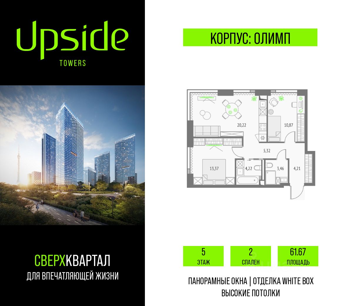Продаётся [room_text] площадью 61.67 кв.м на 5 этаже 19 этажного корпуса Олимп в квартале небоскребов ''Upside Towers''. [text_otdelka] [text_window_view] [text_apartment] Upside Towers - технологичный квартал строится в динамично развивающемся Бутырском районе, в 3 мин. от метро, в 5 мин. от ТТК. На территории 7 га возводится 5 высотных башен от 19 до 58 этажей, названных в честь главных вершин земли. Квартиры с панорамными окнами в пол, высокими потолками и современными инженерными решениями. Благоустроенная зеленая территория включает: приватные дворы, природный комплекс, прогулочный бульвар, ландшафтный парк 2,5 га с сенсорным садом и многофункциональными игровыми и спортивными площадками. В корпусе откроются магазины, кафе и рестораны, а также другие объекты коммерческой инфраструктуры. Большое внимание в проекте уделяется созданию социальной инфраструктуры. Между ''Атласом'' и ''Олимпом'' в трехэтажном стилобате разместится уникальное пространство закрытый клуб для жителей квартала Upside Club площадью 2 000 кв. м. Здесь разместятся: каминный зал с роялем, многофункциональная детская зона c двухуровневым игровым оборудованием для малышей и дошкольников, плей-рум для подростков, домашний кинотеатр, коворкинг, переговорные и лектории. На 47 этаже башни ''Атлас'' откроется SKY SPA Relax с расслабляющей атмосферой, джакузи, сауной, залами для релаксации и йоги. Собственники квартир смогут в любое удобное для них время забронировать посещение спа-зоны через смарт-приложение. На крыше стилобата разместится всесезонная BBQ патио-зона с верандой и закрытыми помещениями для приготовления и отдыха. В башнях откроются смотровые террасы для резидентов с панорамными видами на город, парки, Останкинскую башню, ВДНХ, Ботанический сад и Москву-Сити. Покупая квартиру даже самого минимального размера в Upside Towers, вы получаете в пользование 2 000 м² бесплатных общественных пространств. В рамках проекта строится государственная школа и детский сад, разместится более 15 000 кв.м. коммерческой инфраструктуры. Насыщенная социальная инфраструктура формирует множество сценариев для жизни на территории квартала. В Upside Towers применяются лучшие технологии и практики, чтобы обеспечить высшее качество жизни: Воздух, не уступающий по качеству горному, обеспечит приточно-вытяжная вентиляция. Пятиступенчатая очистка воды с сохранением полезных минералов. Центральное кондиционирование. Внутрипольные конвекторы с естественной конвекцией. Современные системы безопасности и мониторинга микроклимата. Высокоскоростной интернет на всей территории, в квартирах и паркинге за счет усиления GSM-связи всех ведущих операторов. Все места в подземном паркинге оборудованы зарядками для электрокаров. Бутырский район непрерывно развивается и готовится стать новым современным деловым районом Москвы. В рамках программы ''Индустриальные кварталы'' комплексного развития территории Огородного проезда будут построены современные образовательные и спортивные учреждения, торговые центры