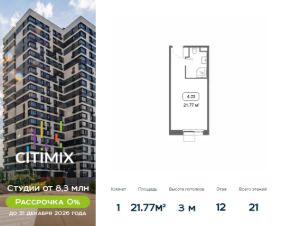 Продаётся студия в строящемся доме (Корпус 4), срок сдачи: III-кв. 2026, общей площадью 21.57 кв.м., на 14 этаже.В 2026 году запланирован перевод корпуса в жилой фонд, что позволит собственникам оформить постоянную регистрацию в Москве.МФК ''CITIMIX'' — студии комфорт-класса, расположенные в районе Тропарёво-Никулино в Западном административном округе Москвы.Комплекс включает в себя пять 21-этажных корпусов и собственный парк между ними. Архитектурный облик комплекса, разработанный бюро ''ADM'', выполнен в современном стиле, а для наружной отделки, уникальной для каждого здания, использовались керамогранитные плиты разных оттенков, витражное остекление и натуральный камень.Все студии в новостройке оснащены современным оборудованием, включая счетчики с возможностью автоматического сбора данных. Во всех подъездах спроектированы уютные лобби-зоны и индивидуальные кладовые.Наличие обширного паркинга, где могут разместиться более 650 автомобилей, позволит закрыть зеленый дворик новостройки для проезда машин и обеспечить жителям уютное, комфортное пространство для семейного отдыха. Первые этажи займут коммерческие помещения, предназначенные для социально-бытовых объектов.В 10 минутах ходьбы расположен парк Школьников, на территории которого есть Очаковские пруды и протекает река Очаковка. В пешей доступности расположен еще один зеленый массив - Тропарёвский лесопарк, занимающий площадь в 218 га. Здесь проложены дорожки для велосипедистов, роллеров и бегунов, обустроены детские площадки и зоны отдыха. Рядом с комплексом находятся детские сады, школа, медклиника, центр развития ребенка, магазины, кафе и отделения банков. Идеальный вариант для студентов, т.к. City-комплекс расположен с такими университетами, как: РАНХиГС, РУДН, РТУ МИРЭА и РНИМУ им. Н.И. Пирогова.МФК ''CITIMIX'' находится в 1,5 км от станции метро ''Озерная'' и 2,4 км от станции метро ''Юго-Западная. Автомобилистам будет удобно воспользоваться выездом на МКАД (3,2 км).Застройщиком квартала выступает компания APSIS GLOBE, основанная в 2008 году. В качестве девелопера компания успешно завершила ряд инфраструктурных, коммерческих объектов на территории Московской области, Москвы, Санкт-Петербурга.