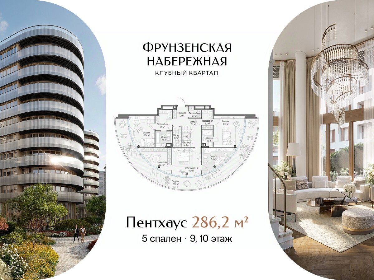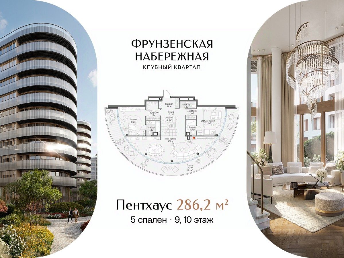 Просторный двухэтажный пентхаус с собственной террасой на крыше. В пентхаусе: • Пять спален, две из которых с ванными комнатами с панорамными окнами • Кухня-гостиная с камином и балконом • Собственная терраса • Потолки 3,67 м Фрунзенская набережная - один из самых желанных районов Москвы, на уровне Остоженки и Патриарших. Поблизости нет и не появится проектов элитного класса: набережная равномерно застроена и клубный квартал завершает формирование этой локации. Масштабная премиальная инфраструктура доступна только резидентам.В большом Clubhouse и на территории парка есть всё для насыщенной жизни вне квартиры: двухэтажный фитнес, многофункциональная спортивная площадка, клубная гостиная и самое большое в элитном классе детское игровое пространство. Клубный квартал ''Фрунзенская набережная'' - место для приватной и комфортной жизни в окружении людей со схожими ценностями. Здесь тихо, будто за городом: сталинская застройка и высокие сосны укрывают жителей от шума и посторонних глаз. Fine Development - это комплексный, вовлечённый и ответственный подход Sminex. Результат этого - совершенные дома и сервисы: восхищающие, удобные и красивые, с высочайшим уровнем заботы на всех этапах жизни с нами.