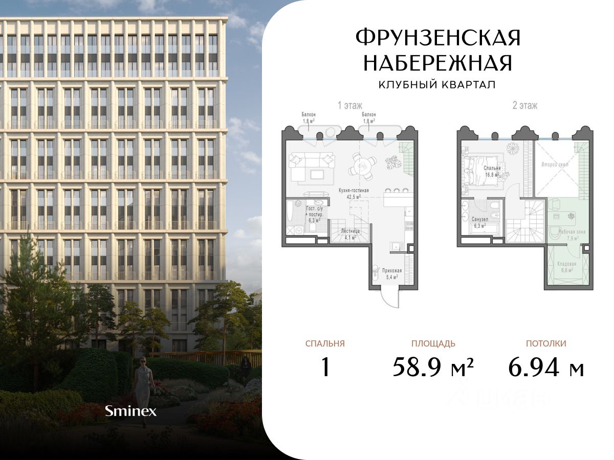 Просторная двухэтажная квартира с одной спальней. Площадь первого этажа 58,9 метра. Продуманное планировочное решение позволит комфортно отделить приватную зону от общественной. Фрунзенская набережная - один из самых желанных районов Москвы, на уровне Остоженки и Патриарших. Новых элитных проектов поблизости нет и не появится: набережная равномерно застроена, а клубный квартал завершает формирование этой локации. Клубный квартал расположен в собственном витражном парке - самом крупном среди элитных проектов Москвы. Его площадь составляет 3,1 гектара - это сопоставимо с территорией 120 теннисных кортов. Вся инфраструктура доступна только жителям. В большом Clubhouse и на территории парка предусмотрено всё для активной и комфортной жизни вне квартиры: двухэтажный фитнес-клуб, многофункциональная спортивная площадка, клубная гостиная и самое большое в элитном классе детское игровое пространство. Клубный квартал ''Фрунзенская набережная'' - приватная и спокойная среда для жизни среди людей со схожими ценностями. Здесь по-настоящему тихо: сталинская архитектура и высокие сосны защищают от городского шума и посторонних взглядов. Девелопер проекта Sminex - лидер на рынке премиальных и элитных домов Москвы. С 2001 года построили более 100 проектов площадью 12 млн м² - покупатели выбирают у нас каждую третью квартиру в этом сегменте.