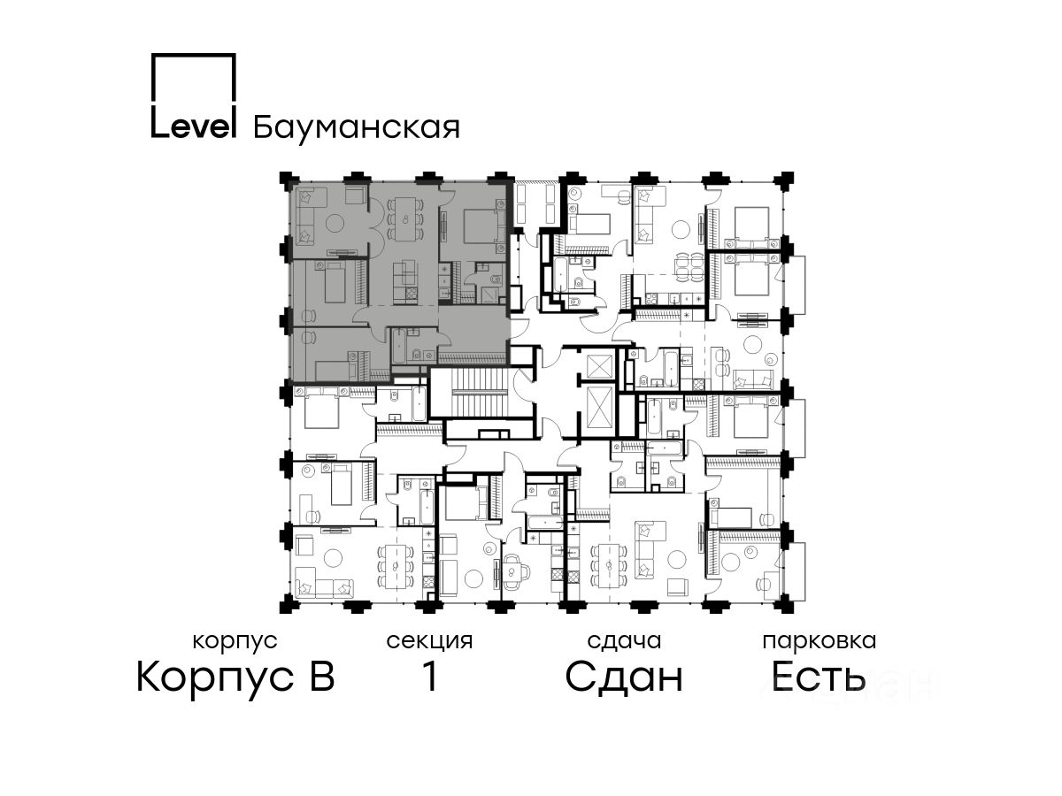 Цена указана с учётом скидки при 100%-й оплате, несубсидированной ипотеке, рассрочке (кроме программы ''Рассрочка 0%''). В Басманном районе (ЦАО) продается 4-комнатная квартира площадью 96.10 кв.м без отделки. Квартира расположена на 15 этаже 17-этажного корпуса '' B'' в жилом комплексе бизнес-класса Level Бауманская (компания Level Group). Отличная транспортная доступность: - 15 мин. пешком до метро ''Бауманская'' и ''Электрозаводская'', - 4 мин. на авто до ТТК, - 8 мин. на авто до Садового кольца, - 15 мин. на авто до Кремля. Продуманный архитектурный проект: - Архитектура от бюро ARCH(E)TYPE, вдохновленная историей района, - 95% квартир с панорамными видами на набережные, парки и сталинские высотки, - Высокие потолки от 3,02 м до 6,3 м, - Лобби с комфортными лаунж-зонами, - Благоустроенный закрытый двор без машин. Расположение и инфраструктура: Level Бауманская расположен в престижном Басманном районе (ЦАО). В пешей доступности находится легендарный МГТУ им. Баумана, Британский и Ломоносовский лицеи, а за 10 минут на автомобиле можно доехать до НИУ ВШЭ и других престижных вузов. На территории проекта предусмотрена развитая внутренняя инфраструктура: собственный детский сад и 10 коммерческих помещений на первых этажах домов. Благоустройство: Концепция благоустройства создана в соавторстве с именитым бюро GAFA. На площади 0,35 га расположатся зоны для отдыха, занятий спортом и прогулок. Во дворе для жителей жилого комплекса будет создан коворкинг прямо на свежем воздухе - открытые беседки и Wi-Fi на территории. Атмосферу приватности подчеркнёт обилие растительности - деревья и кустарники займут 50% двора. За счёт большого количества хвойных насаждений территория жилого комплекса будет зелёной круглый год. Инженерия и комфорт: Жители Level Бауманская не зависят от сезонного отключения горячей воды. Для этого в проекте предусмотрены центральные водонагреватели, обеспечивающие комфорт круглый год. Для безопасности созданы следующие системы контроля доступа: круглосуточное видеонаблюдение всех общественных зон (лобби, двор, лифты, паркинг), вызывные панели у входов на закрытую территорию, видеодомофоны с возможностью управления через мобильное приложение, распознавание автомобильных номеров при въезде/выезде в/из паркинга. По заявке собственнику предоставляется возможность просмотра изображения отдельных видеокамер. Лифты: В жилом комплексе устанавливается лифтовое оборудование Sicher Elevator - одного из ведущих производителей с 20-летним опытом и 40 представительствами по всему миру. Кабины от Sicher Elevator отличаются тихим и плавным ходом, особой износостойкостью и современными технологическими и дизайнерскими решениями. Все лифты имеют прямой доступ в паркинг с жилых этажей. В домах также предусмотрен сервисный лифт. Грузоподъёмность лифтов от 450 до 1000 кг, скорость 1,6 м/с.