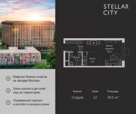 Продается квартира от надежного застройщика Tashir Estate в квартале бизнес-класса Stellar City в ЗАО Москвы. Площадь квартиры составляет: 31.1 кв. м, потолки: 3.1 м Квартира находится на 19 этаже, 4 корпуса жилого квартала Stellar City — микрогорода будущего на орбите Москвы. Stellar City — квартал в ЗАО Москвы вблизи инновационного центра Сколково. В окружении — 11 парков и природных зон, в том числе Долина реки Сетунь, Мещерский лес и парк развлечений The Rink. Город в городе Чтобы дом и инфраструктура вокруг отвечала динамичному лайфстайлу жителя мегаполиса, в основу проекта легла концепция город в городе, которая позволяет решать все бытовые вопросы in-home. В квартале будут возведены школа и детский сад, воркаут-зоны, променад, вело и беговые дорожки, детские площадки для каждого корпуса, а также коммерция на первых этажах для ежедневных покупок. Все необходимое — на расстоянии нескольких шагов. Изящные и лаконичные лобби Авторский дизайн, натуральные материалы в отделке и безупречный интерьер вне времени. Лобби и холлы в проекте бизнес-класса Stellar City ничем не отличаются от входных групп в премиум-сегменте благодаря качественным европейским материалам в отделке, стильному дизайну, консьерж-сервису и уютной зоне ожидания с журнальными столиками и мягкой мебелью. Комфорт и безопасность Закрытая территория, охрана, система СКУД, специально разработанное мобильное приложение дома для резидентов и подземный паркинг с круглосуточным наблюдением и доступом с помощью автоматического считывания номера авто.