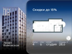 Цена указана с учётом скидки при 100%-й оплате, несубсидированной ипотеке, рассрочке (кроме программы ''Рассрочка 0%'').Продается студия площадью 28.60 кв. м с отделкой. Квартира находится на 6 этаже 26-этажного корпуса 4, в новом жилом комплексе бизнес-класса Левел Войковская, расположенном рядом с живописным заповедником ''Покровское-Стрешнево'' (застройщик - компания Level Group/Левел групп).Прекрасная транспортная доступность- 7 мин. пешком до станции МЦК ''Балтийская'',- 15 мин. пешком до станции метро ''Войковская'',- 8 мин. на машине до ТТК,- 15 мин. на машине до центра Москвы,- 20 мин. на машине до Москва-Сити. Продуманный архитектурный проект- стильная архитектура от мастерской Фефелова В. В.,- панорамные виды на парки, Химкинское водохранилище и Останкинскую башню,- лобби с высотой потолков до 6,45 метров,- более 20 видов планировок, включая редкие форматы квартир с террасой и увеличенной высотой потолков до 5,42 метров,- 2 варианта дизайнерской отделки в корпусе 4 как дополнительная опция к отделке white box: стиль Modern в светлых холодных тонах и стиль Classic в нейтральной бежевой гамме. Квартиры в корпусах 3 и 5 сдаются без отделки. РасположениеЖилой комплекс Левел Войковская строится в престижном Северном округе Москвы, где развитая инфраструктура и живописная природа переплетаются в единый ансамбль.Войковский район окружают парки и набережные. В шаговой доступности - парк ''Покровское-Стрешнево'', не более 15-ти минут на велосипеде занимает путь до Тимирязевского парка и 9-ти минут до парка усадьбы Михалково.Рядом более 60 школ, 75 дошкольных учреждений, 17 государственных и 6 частных вузов, 25 супермаркетов, 4 торговых центра, среди которых ТЦ ''Метрополис'' и ТЦ ''Авиапарк''. Внутренняя инфраструктураНа территории жилого комплекса предусмотрены коммерческие помещения: кафе, ресторан, пекарня и другие сервисы на первых этажах корпусов. Для жителей будет доступен отапливаемый подземный паркинг на 244 машино-места с доступом с любого этажа на лифте. На территории паркинга будет расположено 125 кладовых помещений для хранения сезонного инвентаря. Лобби и благоустройствоДизайн лобби жилого комплекса Левел Войковская создан совместно с бюро BLANK. Теплая цветовая гамма, ресепшен, зоны ожидания, лапомойки и гостевые санузлы - каждая деталь превращает лобби в комфортное продолжение вашего дома.1,15 га площади в первых двух этапах строительства отведено под приватный внутренний двор, который спроектирован совместно с бюро ''Правда''. Детские площадки для всех возрастов, спортивные пространства для йоги, воркаута и петанка, уютные зоны для тихого отдыха или работы. Здесь утро начинается с вдохновения, а вечер наполнен приятными моментами. ЛифтыКомфортное перемещение внутри жилого комплекса обеспечат надёжные лифты с доступом в паркинг с жилых этажей. В каждом корпусе предусмотрено по 3 грузопассажирских лифта.