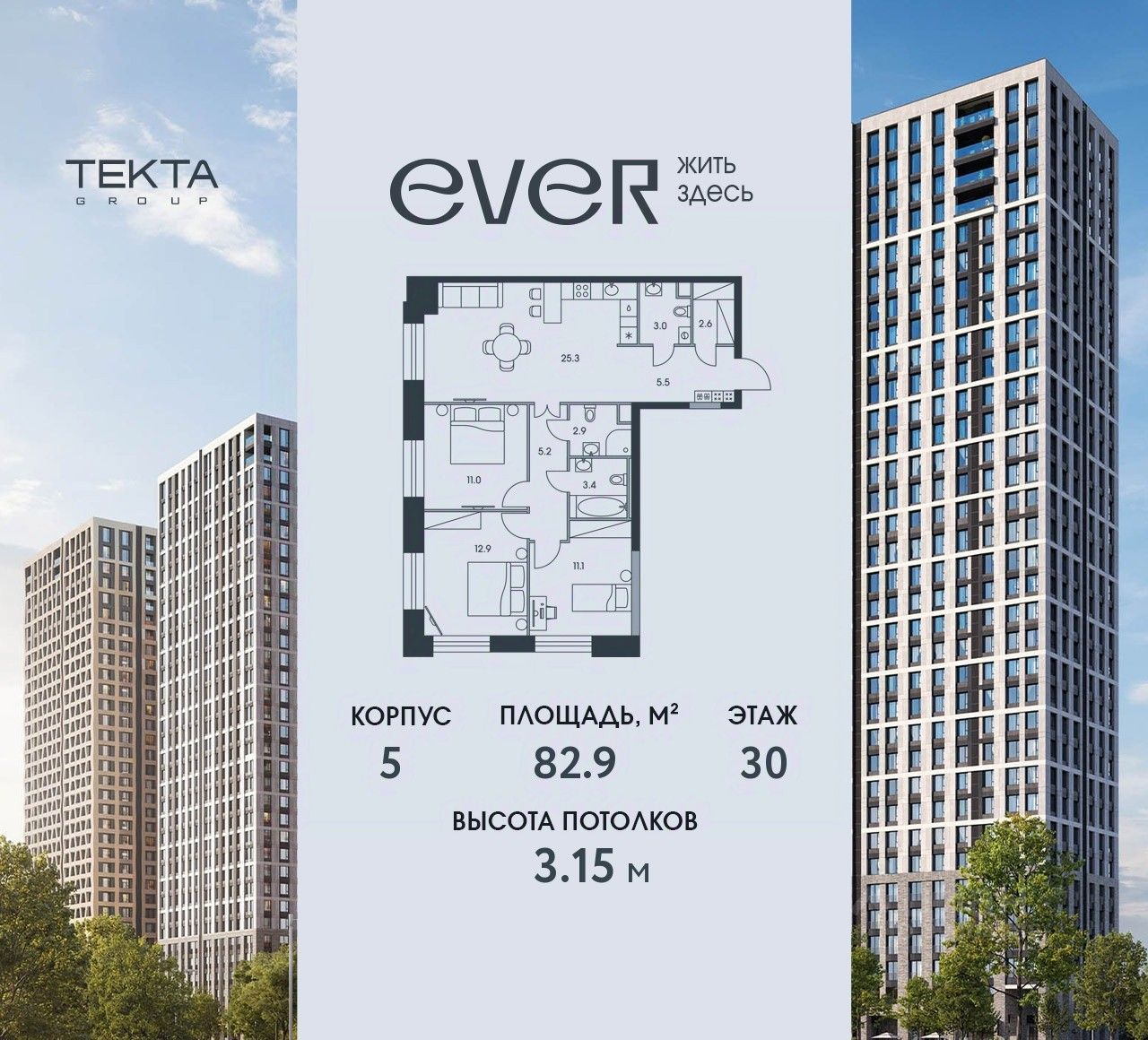 В продаже — двухкомнатная квартира с чистовой отделкой, общей площадью 83,32 кв. м. Квартира расположена на первом этаже одинадцатиэтажной секции дома класса Адвансд в новом районе СберСити, который строит Сбер. Дом находится на первой береговой линии Москвы-реки. Дом возводится по технологии монолитного строительства. Отделка фасадов выполнена из природного камня, глазурованной плитки и алюминия. В квартире проведены работы по улучшению шумоизоляции, установлены двухкамерные стеклопакеты с низкоэмиссионными стёклами, минимизирующими теплопотери. Высота потолков — 3,25 м, в санузлах — тёплый пол. В доме расположены: • уютное лобби, • лапомойка, • общественная терраса, • коворкинг для жителей, • собственная спортивная студия, • колясочная и велосипедная комната на первом этаже, • детская игровая комната, • подземный паркинг. СберСити — это новый жилой и деловой район на западе Москвы, в одном из самых экологически чистых и престижных мест столицы. Это первая в России и крупнейшая в мире инновационная городская среда, созданная по международным стандартам зелёного проектирования. Здесь внедряются решения в области энергоснабжения, вакуумного мусороудаления, тестирования зелёных технологий, а в дальнейшем — системы искусственного интеллекта для управления домами и городской инфраструктурой. Строительство проекта началось в 2021 году, заселение первых корпусов — с лета 2024-го. Общая площадь территории — 461 га, из них более 2,5 млн кв. м жилья и около 833 тыс. кв. м офисных пространств. Будет построено 7 школ, 13 детских садов и 2 поликлиники. В СберСити будут жить 65 тыс. человек и работать 70 тыс. Развитием территории занимается АО ''Рублёво-Архангельское'', входящее в группу Сбер. СберСити — место, где хочется жить, работать и растить детей. Переезжайте в СберСити!