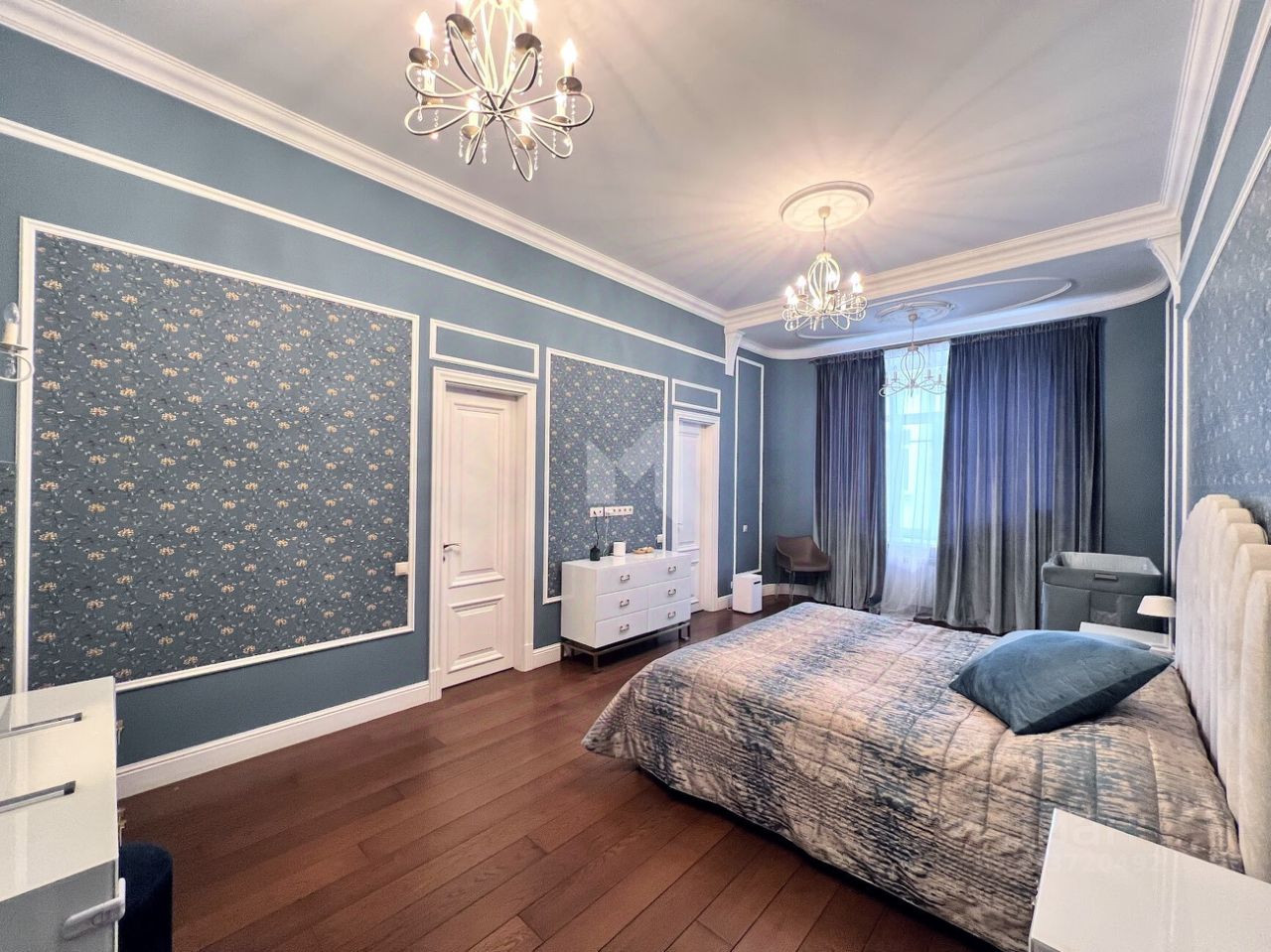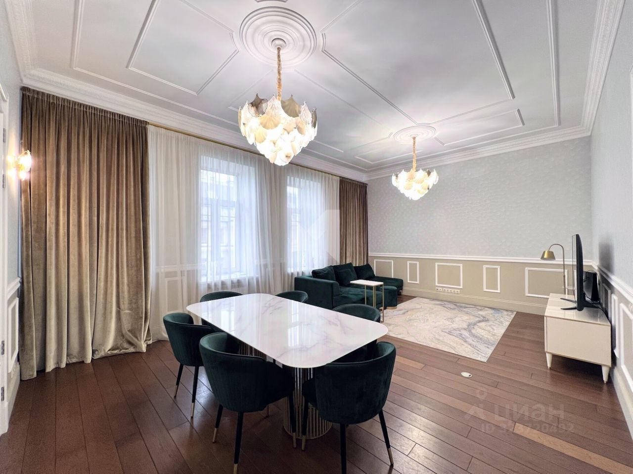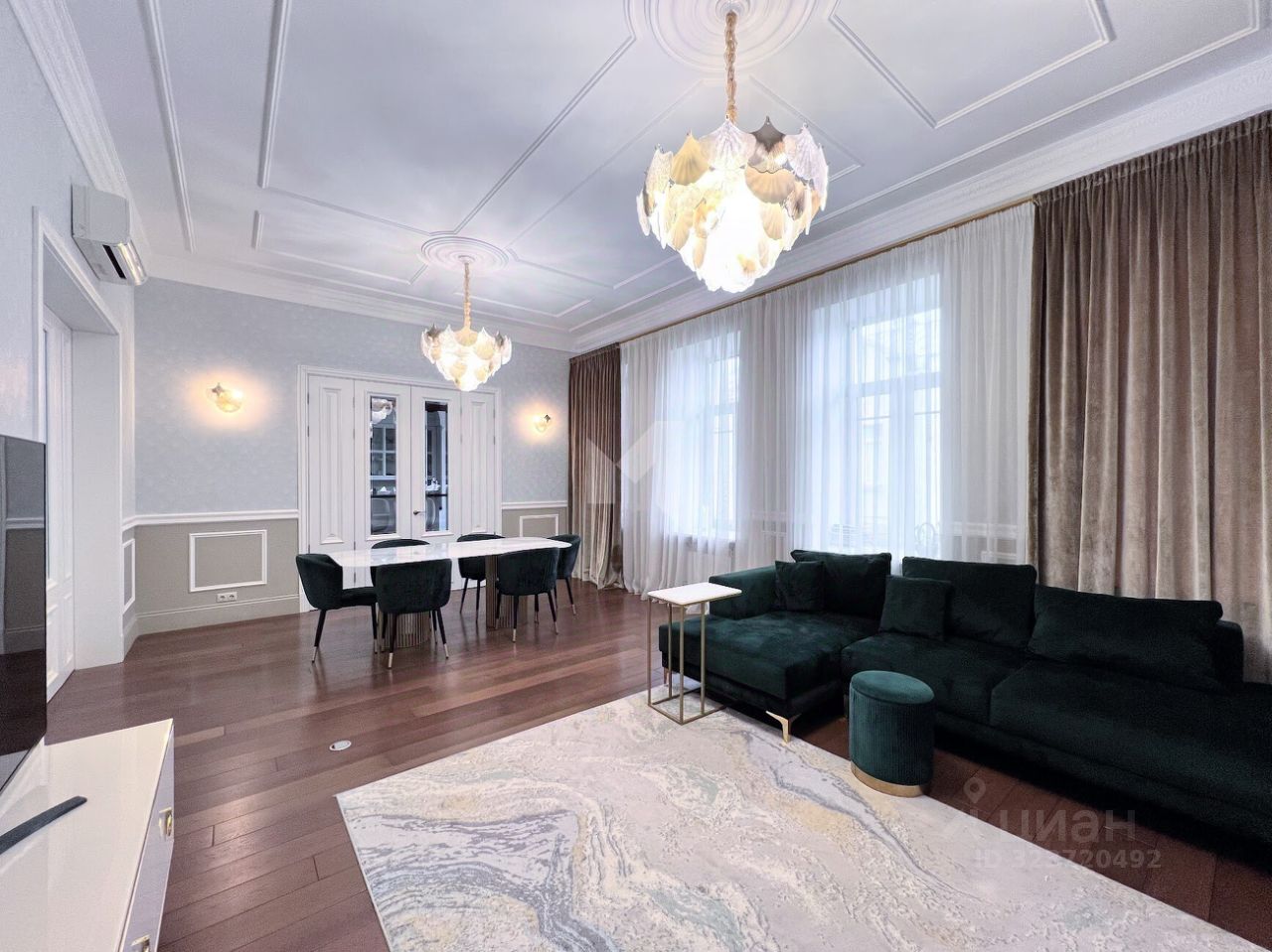 Просторная квартира с 3-мя спальнями общей площадью 287 м² в особняке ''Пречистенка 13'' в Хамовниках. Квартира с дизайнерским ремонтом расположена на 5-м этаже в корпусе 1. Выполнена отделка в стиле неоклассики с использованием высококачественных материалов — премиальная керамическая плитка, мрамор, паркет из ценных пород. Высота потолков 3,8 метра. Квартира полностью меблирована и укомплектована бытовой техникой. Все элементы декора, люстры и светильники подобраны по индивидуальному дизайн-проекту, дополнительным украшением интерьера служат колонны и расписные стены. Функциональная планировка: гостиная с выходом на балкон, кухня-столовая, мастер-спальня с собственной гардеробной и ванной, 2 спальни, 3 санузла, гардеробная, постирочная, холл. Благодаря большому количеству окон пространство наполнено светом, открываются панорамные виды на улицу Пречистенка, Лопухинский переулок и во внутренний двор. Описание комплекса ''Пречистенка 13'' — 8-этажный исторический особняк в стиле неоклассицизм, построен в 1912 по заказу владельца торгово-строительного акционерного общества Якова Рекка. В конце 80-х годов здание реконструировали, в 2014 году был возвращен исторический облик — полукруглый эркер со скульптурами, башенку с часами, внутреннюю отделку восстановили по архивным эскизам. На верхних этажах разместились трехуровневые пентхаусы с просторными террасами общей площадью 1 500 м², в каждой квартире есть возможность установить дровяной камин.