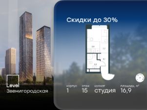 Цена указана с учётом скидки при 100%-й оплате, несубсидированной ипотеке, рассрочке (кроме программы ''Рассрочка 0%'').В жилом квартале продаётся студия площадью 16.90 кв.м white box. Квартира расположена на 17 этаже 48 этажного корпуса 1 в жилом комплексе комфорт класса Левел Звенигородская (компания Левел Group/Левел групп). Отличная транспортная доступность- 5 мин. пешком до метро ''Звенигородская'' (откроется к окончанию строительства),- 18 мин. пешком до станции МЦК ''Хорошёво'' и станции БКЛ ''Народное ополчение'',- 4 мин. на авто до ТТК,- 8 мин. на авто до Садового кольца,- 15 мин. на авто до Кремля. Продуманный архитектурный проект- Концепция от студии Станислава Михаловского, в основу которой легло единение природы и города,- Двухкамерные стеклопакеты в окнах, алюминиевый и ПВХ профиль - в квартирах тепло зимой и прохладно летом,- С верхних этажей откроются панорамные виды на город, Москву-реку, ''Москва-Сити'' и Москворецкий парк,- Лобби со всеми удобствами: окна в пол, высокие потолки до 4,7 м, лаунж-зоны, колясочные, гостевые санузлы и мойки для лап животных,- Централизованные водонагреватели гарантируют круглогодичную подачу горячей воды в каждую квартиру. БлагоустройствоКонцепция благоустройства разработана совместно с бюро UNK landscape. Высота башен приближается к 200 метрам - они словно касаются неба. Небесный простор проецируется на территорию двора с помощью подсветки, визуально увеличивая пространство и отражаясь в авторских элементах архитектуры.На территории площадью 0,45 га расположатся:- ''Облако событий'' - место встреч и общения,- ''Облако спорта'' - всё для поддержания себя в форме,- ''Облако принятия решений'' - пространство для работы на свежем воздухе,- ''Облако спокойствия'' - для отдыха в тишине природы,- ''Облако игр'' - площадки для подростков и самых маленьких. ИнфраструктураВ жилом комплексе откроется 21 коммерческое помещение: продуктовые лавки, кафе, салоны красоты, службы доставки и творческие студии.Этап 1 включает строительство двухуровневого подземного паркинга. Всего здесь расположится 351 машино-место, включая семейные места, и 264 кладовых помещения.В распоряжении жителей развитая инфраструктура района: 15 супермаркетов, 5 спортивных объектов, 9 медучреждений, 7 детских садов, 4 школы, 3 благоустроенных парка - всё в шаговой доступности. ИнженерияКомфортное перемещение внутри домов будут обеспечивать надёжные лифты с доступом в паркинг с жилых этажей. В каждом корпусе предусмотрено до шести кабин, включая сервисные лифты.Попасть на территорию комплекса можно только по единому ключу доступа. Видеонаблюдение установлено на входах в подъезды, в лобби, в общих зонах, на въезде в паркинг. Гости смогут связаться с жителями дома через входные видеопанели, а управлять доступом на территорию можно через видеодомофон или приложение на телефоне.