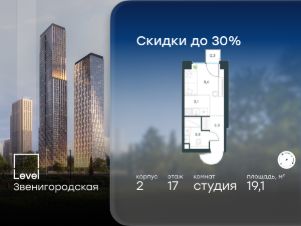 Цена указана с учётом скидки при 100%-й оплате, несубсидированной ипотеке, рассрочке (кроме программы ''Рассрочка 0%'').В жилом квартале продаётся студия площадью 19.10 кв.м без отделки. Квартира расположена на 17 этаже 64 этажного корпуса 2 в жилом комплексе комфорт класса Левел Звенигородская (компания Левел Group/Левел групп). Отличная транспортная доступность- 5 мин. пешком до метро ''Звенигородская'' (откроется к окончанию строительства),- 18 мин. пешком до станции МЦК ''Хорошёво'' и станции БКЛ ''Народное ополчение'',- 4 мин. на авто до ТТК,- 8 мин. на авто до Садового кольца,- 15 мин. на авто до Кремля. Продуманный архитектурный проект- Концепция от студии Станислава Михаловского, в основу которой легло единение природы и города,- Двухкамерные стеклопакеты в окнах, алюминиевый и ПВХ профиль - в квартирах тепло зимой и прохладно летом,- С верхних этажей откроются панорамные виды на город, Москву-реку, ''Москва-Сити'' и Москворецкий парк,- Лобби со всеми удобствами: окна в пол, высокие потолки до 4,7 м, лаунж-зоны, колясочные, гостевые санузлы и мойки для лап животных,- Централизованные водонагреватели гарантируют круглогодичную подачу горячей воды в каждую квартиру. БлагоустройствоКонцепция благоустройства разработана совместно с бюро UNK landscape. Высота башен приближается к 200 метрам - они словно касаются неба. Небесный простор проецируется на территорию двора с помощью подсветки, визуально увеличивая пространство и отражаясь в авторских элементах архитектуры.На территории площадью 0,45 га расположатся:- ''Облако событий'' - место встреч и общения,- ''Облако спорта'' - всё для поддержания себя в форме,- ''Облако принятия решений'' - пространство для работы на свежем воздухе,- ''Облако спокойствия'' - для отдыха в тишине природы,- ''Облако игр'' - площадки для подростков и самых маленьких. ИнфраструктураВ жилом комплексе откроется 21 коммерческое помещение: продуктовые лавки, кафе, салоны красоты, службы доставки и творческие студии.Этап 1 включает строительство двухуровневого подземного паркинга. Всего здесь расположится 351 машино-место, включая семейные места, и 264 кладовых помещения.В распоряжении жителей развитая инфраструктура района: 15 супермаркетов, 5 спортивных объектов, 9 медучреждений, 7 детских садов, 4 школы, 3 благоустроенных парка - всё в шаговой доступности. ИнженерияКомфортное перемещение внутри домов будут обеспечивать надёжные лифты с доступом в паркинг с жилых этажей. В каждом корпусе предусмотрено до шести кабин, включая сервисные лифты.Попасть на территорию комплекса можно только по единому ключу доступа. Видеонаблюдение установлено на входах в подъезды, в лобби, в общих зонах, на въезде в паркинг. Гости смогут связаться с жителями дома через входные видеопанели, а управлять доступом на территорию можно через видеодомофон или приложение на телефоне.