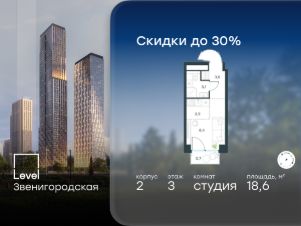 Цена указана с учётом скидки при 100%-й оплате, несубсидированной ипотеке, рассрочке (кроме программы ''Рассрочка 0%'').В жилом квартале продаётся студия площадью 18.60 кв.м без отделки. Квартира расположена на 3 этаже 64 этажного корпуса 2 в жилом комплексе комфорт класса Левел Звенигородская (компания Левел Group/Левел групп). Отличная транспортная доступность- 5 мин. пешком до метро ''Звенигородская'' (откроется к окончанию строительства),- 18 мин. пешком до станции МЦК ''Хорошёво'' и станции БКЛ ''Народное ополчение'',- 4 мин. на авто до ТТК,- 8 мин. на авто до Садового кольца,- 15 мин. на авто до Кремля. Продуманный архитектурный проект- Концепция от студии Станислава Михаловского, в основу которой легло единение природы и города,- Двухкамерные стеклопакеты в окнах, алюминиевый и ПВХ профиль - в квартирах тепло зимой и прохладно летом,- С верхних этажей откроются панорамные виды на город, Москву-реку, ''Москва-Сити'' и Москворецкий парк,- Лобби со всеми удобствами: окна в пол, высокие потолки до 4,7 м, лаунж-зоны, колясочные, гостевые санузлы и мойки для лап животных,- Централизованные водонагреватели гарантируют круглогодичную подачу горячей воды в каждую квартиру. БлагоустройствоКонцепция благоустройства разработана совместно с бюро UNK landscape. Высота башен приближается к 200 метрам - они словно касаются неба. Небесный простор проецируется на территорию двора с помощью подсветки, визуально увеличивая пространство и отражаясь в авторских элементах архитектуры.На территории площадью 0,45 га расположатся:- ''Облако событий'' - место встреч и общения,- ''Облако спорта'' - всё для поддержания себя в форме,- ''Облако принятия решений'' - пространство для работы на свежем воздухе,- ''Облако спокойствия'' - для отдыха в тишине природы,- ''Облако игр'' - площадки для подростков и самых маленьких. ИнфраструктураВ жилом комплексе откроется 21 коммерческое помещение: продуктовые лавки, кафе, салоны красоты, службы доставки и творческие студии.Этап 1 включает строительство двухуровневого подземного паркинга. Всего здесь расположится 351 машино-место, включая семейные места, и 264 кладовых помещения.В распоряжении жителей развитая инфраструктура района: 15 супермаркетов, 5 спортивных объектов, 9 медучреждений, 7 детских садов, 4 школы, 3 благоустроенных парка - всё в шаговой доступности. ИнженерияКомфортное перемещение внутри домов будут обеспечивать надёжные лифты с доступом в паркинг с жилых этажей. В каждом корпусе предусмотрено до шести кабин, включая сервисные лифты.Попасть на территорию комплекса можно только по единому ключу доступа. Видеонаблюдение установлено на входах в подъезды, в лобби, в общих зонах, на въезде в паркинг. Гости смогут связаться с жителями дома через входные видеопанели, а управлять доступом на территорию можно через видеодомофон или приложение на телефоне.