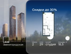 Цена указана с учётом скидки при 100%-й оплате, несубсидированной ипотеке, рассрочке (кроме программы ''Рассрочка 0%'').В жилом квартале продаётся студия площадью 18.50 кв.м без отделки. Квартира расположена на 29 этаже 64 этажного корпуса 2 в жилом комплексе комфорт класса Левел Звенигородская (компания Левел Group/Левел групп). Отличная транспортная доступность- 5 мин. пешком до метро ''Звенигородская'' (откроется к окончанию строительства),- 18 мин. пешком до станции МЦК ''Хорошёво'' и станции БКЛ ''Народное ополчение'',- 4 мин. на авто до ТТК,- 8 мин. на авто до Садового кольца,- 15 мин. на авто до Кремля. Продуманный архитектурный проект- Концепция от студии Станислава Михаловского, в основу которой легло единение природы и города,- Двухкамерные стеклопакеты в окнах, алюминиевый и ПВХ профиль - в квартирах тепло зимой и прохладно летом,- С верхних этажей откроются панорамные виды на город, Москву-реку, ''Москва-Сити'' и Москворецкий парк,- Лобби со всеми удобствами: окна в пол, высокие потолки до 4,7 м, лаунж-зоны, колясочные, гостевые санузлы и мойки для лап животных,- Централизованные водонагреватели гарантируют круглогодичную подачу горячей воды в каждую квартиру. БлагоустройствоКонцепция благоустройства разработана совместно с бюро UNK landscape. Высота башен приближается к 200 метрам - они словно касаются неба. Небесный простор проецируется на территорию двора с помощью подсветки, визуально увеличивая пространство и отражаясь в авторских элементах архитектуры.На территории площадью 0,45 га расположатся:- ''Облако событий'' - место встреч и общения,- ''Облако спорта'' - всё для поддержания себя в форме,- ''Облако принятия решений'' - пространство для работы на свежем воздухе,- ''Облако спокойствия'' - для отдыха в тишине природы,- ''Облако игр'' - площадки для подростков и самых маленьких. ИнфраструктураВ жилом комплексе откроется 21 коммерческое помещение: продуктовые лавки, кафе, салоны красоты, службы доставки и творческие студии.Этап 1 включает строительство двухуровневого подземного паркинга. Всего здесь расположится 351 машино-место, включая семейные места, и 264 кладовых помещения.В распоряжении жителей развитая инфраструктура района: 15 супермаркетов, 5 спортивных объектов, 9 медучреждений, 7 детских садов, 4 школы, 3 благоустроенных парка - всё в шаговой доступности. ИнженерияКомфортное перемещение внутри домов будут обеспечивать надёжные лифты с доступом в паркинг с жилых этажей. В каждом корпусе предусмотрено до шести кабин, включая сервисные лифты.Попасть на территорию комплекса можно только по единому ключу доступа. Видеонаблюдение установлено на входах в подъезды, в лобби, в общих зонах, на въезде в паркинг. Гости смогут связаться с жителями дома через входные видеопанели, а управлять доступом на территорию можно через видеодомофон или приложение на телефоне.