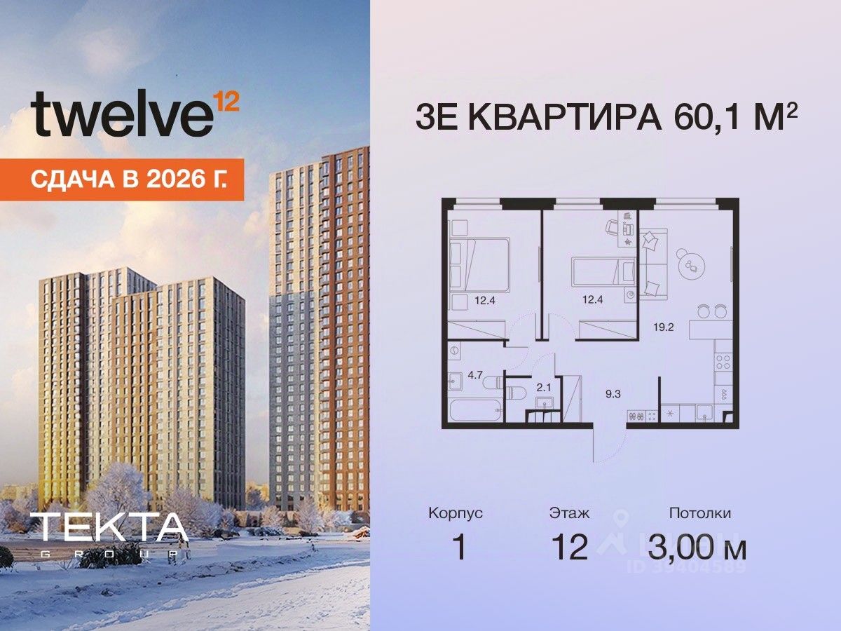 Рассрочка 0% с платежом от 120 000 ? в месяц. Сдача уже в 2026 году 3-комн. квартира в ЖК ''Twelve'' на 12 этаже в 34 этажном здании Корпус 1. Общая площадь: 60.1 кв.м., жилая: 33.30 кв.м. Высота потолков 3.00 м. ЖК Twelve от застройщика Tekta Group — это новый уровень жизни в районе Нагорный в 3-х минутах от станции метро. Проект представляет собой воплощение современной концепции комфортной жизни, где функциональность органично сочетается с эстетикой. Архитектура Twelve создает атмосферу, вдохновляющую на успех и располагающую к позитивным эмоциям. Дом, в котором каждый день будет наполнен уютом, а не рутинной работой и дорожными пробками. Twelve предлагает своим жильцам продуманные планировки, возможность объединения квартир, а также увидеть красоту города через угловое остекление увеличенных окон. Особое внимание уделено комфорту жителей: благоустроенная территория, зеленые насаждения, детские площадки, парковка. ЖК Twelve — это больше, чем просто жилье: это атмосфера умиротворенности, комфорта и гармонии.