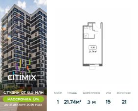 Продаётся студия в строящемся доме (Корпус 4), срок сдачи: III-кв. 2026, общей площадью 22.09 кв.м., на 16 этаже.В 2026 году запланирован перевод корпуса в жилой фонд, что позволит собственникам оформить постоянную регистрацию в Москве.МФК ''CITIMIX'' — студии комфорт-класса, расположенные в районе Тропарёво-Никулино в Западном административном округе Москвы.Комплекс включает в себя пять 21-этажных корпусов и собственный парк между ними. Архитектурный облик комплекса, разработанный бюро ''ADM'', выполнен в современном стиле, а для наружной отделки, уникальной для каждого здания, использовались керамогранитные плиты разных оттенков, витражное остекление и натуральный камень.Все студии в новостройке оснащены современным оборудованием, включая счетчики с возможностью автоматического сбора данных. Во всех подъездах спроектированы уютные лобби-зоны и индивидуальные кладовые.Наличие обширного паркинга, где могут разместиться более 650 автомобилей, позволит закрыть зеленый дворик новостройки для проезда машин и обеспечить жителям уютное, комфортное пространство для семейного отдыха. Первые этажи займут коммерческие помещения, предназначенные для социально-бытовых объектов.В 10 минутах ходьбы расположен парк Школьников, на территории которого есть Очаковские пруды и протекает река Очаковка. В пешей доступности расположен еще один зеленый массив - Тропарёвский лесопарк, занимающий площадь в 218 га. Здесь проложены дорожки для велосипедистов, роллеров и бегунов, обустроены детские площадки и зоны отдыха. Рядом с комплексом находятся детские сады, школа, медклиника, центр развития ребенка, магазины, кафе и отделения банков. Идеальный вариант для студентов, т.к. City-комплекс расположен с такими университетами, как: РАНХиГС, РУДН, РТУ МИРЭА и РНИМУ им. Н.И. Пирогова.МФК ''CITIMIX'' находится в 1,5 км от станции метро ''Озерная'' и 2,4 км от станции метро ''Юго-Западная. Автомобилистам будет удобно воспользоваться выездом на МКАД (3,2 км).Застройщиком квартала выступает компания APSIS GLOBE, основанная в 2008 году. В качестве девелопера компания успешно завершила ряд инфраструктурных, коммерческих объектов на территории Московской области, Москвы, Санкт-Петербурга.