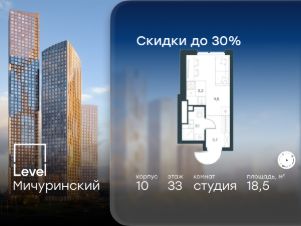 Цена указана с учётом скидки при 100%-й оплате, несубсидированной ипотеке, рассрочке (кроме программы ''Рассрочка 0%''). В жилом квартале, расположенном на границе с природным заказником ''Долина реки Очаковки'', продаётся студия площадью 18.50 кв.м с отделкой white box. Квартира расположена на 33 этаже 42-этажного корпуса 10 в жилом комплексе бизнес-класса Level Мичуринский (компания Level Group/Левел групп). Отличная транспортная доступность: - от 10 мин. пешком до станции метро ''Мичуринский проспект''- 15 мин. пешком до станции метро ''Аминьевская''- 7 мин. на авто до МКАД- 10 мин. на авто до ТТК- 15 мин. на авто до Москва-Сити Продуманный архитектурный проект:- Выразительная архитектура от известных бюро: корпуса 1-6 - СПИЧ, корпуса 7-13 - Borisov Architects,- Из окон открываются живописные виды на парки, Москва-Сити и МГУ,- Высокие потолки до 6,35 м,- Стильные лобби с окнами в пол и высокими потолками до 4,7 м,- С каждого этажа дома на лифте можно спуститься в подземный отапливаемый паркинг.Расположение:Level Мичуринский строится в одном из самых зелёных районов Москвы - Очаково-Матвеевское. Этот уголок столицы идеален для поддержания здорового образа жизни. В шаговой доступности от проекта находятся заказник ''Долина реки Очаковки'' - 1 мин. пешком и Очаковский парк - 7 мин. пешком. На велосипеде можно добраться до таких парков, как ''Событие'', парк Олимпийской деревни, парк 50-летия Октября и парк Школьников.В 15 минутах езды на авто расположено более 30 детских садов (из них 14 в пешей доступности), 32 школы (из них 13 в пешей доступности) и 14 вузов. Также в ближайшем окружении - более 25 медицинских учреждений, 11 спортивных клубов и 22 продуктовых супермаркета.Внутренняя инфраструктура:На территории жилого комплекса строится три детских сада и школа. На первых этажах домов откроется супермаркет, фитнес-центр, ресторан, кафе и другие сервисы. Подземные этажи займут паркинги: трёхуровневые - в этапах 1 и 2, одноуровневый - в этапах 3 и 4.Преимущества проекта:- 4,5 га благоустроенной территории с видовым мостом, уличным кинотеатром, зонами для тихого отдыха, работы, воркаута, площадки для петанка, футбола, настольного тенниса и пляжного волейбола.- Дизайнерские лобби с панорамным видом на двор, мойками для лап животных и комфортными зонами ожидания.- Безопасность жителей: круглосуточное видеонаблюдение всех зон общего пользования (лобби, лифты, паркинги, детские площадки), система контроля доступа, управление видеодомофоном через мобильное приложение, единый ключ доступа на территорию жилого комплекса.- Технологии и комфорт: высокоскоростной Wi-Fi в лобби и на придомовой территории, автоматическая система контроля и учёта ресурсов, абонентская связь с консьержем, распознавание номеров автомобилей при въезде в паркинг и выезде из него.