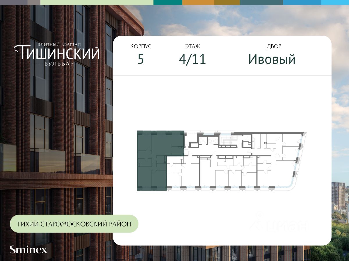 В продаже 3-комнатная квартира квартира в элитном квартале ''Тишинский бульвар''. Общая площадь квартиры - 114.10 кв.м. Этаж 4 из 11. Корпус Ивовый 5. ''Тишинский бульвар'' - тихий зелёный элитный квартал на Тишинке, в престижном и комфортном районе центра Москвы. В нём создан уникальный для элитного дома прогулочный бульвар в своём огромном парке 1,9 га. В парке оборудованы зоны для активного и тихого отдыха, крытые галереи, приватные зелёные комнаты, многофункциональная спортивная площадка, воркаут-зона, детская площадка, сухой фонтан, ручей. В пешей доступности Римско-католический кафедральный собор. Всего в полутора километрах от квартала находятся Патриаршие пруды - излюбленное место для летних прогулок, воскресных бранчей и романтических ужинов. Белая площадь расположена ещё ближе - на расстоянии 1,2 километра. Это точка концентрации деловой жизни и модных ресторанов. В ''Тишинский бульваре'' только для жителей и их гостей создан уникальный для элитного дома прогулочный бульвар в собственном огромном парке площадью 2,1 га, который занимает 70% территории квартала. Бульвар проходит через весь квартал и объединяет в общее пространство три двора: Кленовый, Рябиновый и Ивовый. В парке созданы крытые галереи и приватные зелёные комнаты для отдыха и медитаций в любую погоду. Насыщенное озеленение многолетними растениями с разными периодами цветения сохраняет территорию квартала красивой круглый год. В квартале насыщенная инфраструктура только для жителей, включая Clubhouse. Здесь оборудованы пространства для здорового образа жизни по стандарту FIT LAB: в парке - многофункциональная спортивная площадка, воркаут-зона, место для занятий йогой и медитации, бесплатный фитнес-клуб с бассейном. Для маленьких жителей доступны детская площадка и игровая комната по стандарту KIDS LAB. Дома оснащены самыми полными и лучшими системами.