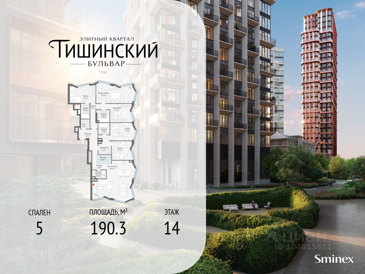 В продаже многокомнатная квартира квартира в элитном квартале ''Тишинский бульвар''. Общая площадь квартиры - 190.30 кв.м. Этаж 14 из 14. Корпус Рябиновый 3. ''Тишинский бульвар'' - тихий зелёный элитный квартал на Тишинке, в престижном и комфортном районе центра Москвы. В нём создан уникальный для элитного дома прогулочный бульвар в своём огромном парке 1,9 га. В парке оборудованы зоны для активного и тихого отдыха, крытые галереи, приватные зелёные комнаты, многофункциональная спортивная площадка, воркаут-зона, детская площадка, сухой фонтан, ручей. В пешей доступности Римско-католический кафедральный собор. Всего в полутора километрах от квартала находятся Патриаршие пруды - излюбленное место для летних прогулок, воскресных бранчей и романтических ужинов. Белая площадь расположена ещё ближе - на расстоянии 1,2 километра. Это точка концентрации деловой жизни и модных ресторанов. В ''Тишинский бульваре'' только для жителей и их гостей создан уникальный для элитного дома прогулочный бульвар в собственном огромном парке площадью 2,1 га, который занимает 70% территории квартала. Бульвар проходит через весь квартал и объединяет в общее пространство три двора: Кленовый, Рябиновый и Ивовый. В парке созданы крытые галереи и приватные зелёные комнаты для отдыха и медитаций в любую погоду. Насыщенное озеленение многолетними растениями с разными периодами цветения сохраняет территорию квартала красивой круглый год. В квартале насыщенная инфраструктура только для жителей, включая Clubhouse. Здесь оборудованы пространства для здорового образа жизни по стандарту FIT LAB: в парке - многофункциональная спортивная площадка, воркаут-зона, место для занятий йогой и медитации, бесплатный фитнес-клуб с бассейном. Для маленьких жителей доступны детская площадка и игровая комната по стандарту KIDS LAB. Дома оснащены самыми полными и лучшими системами.