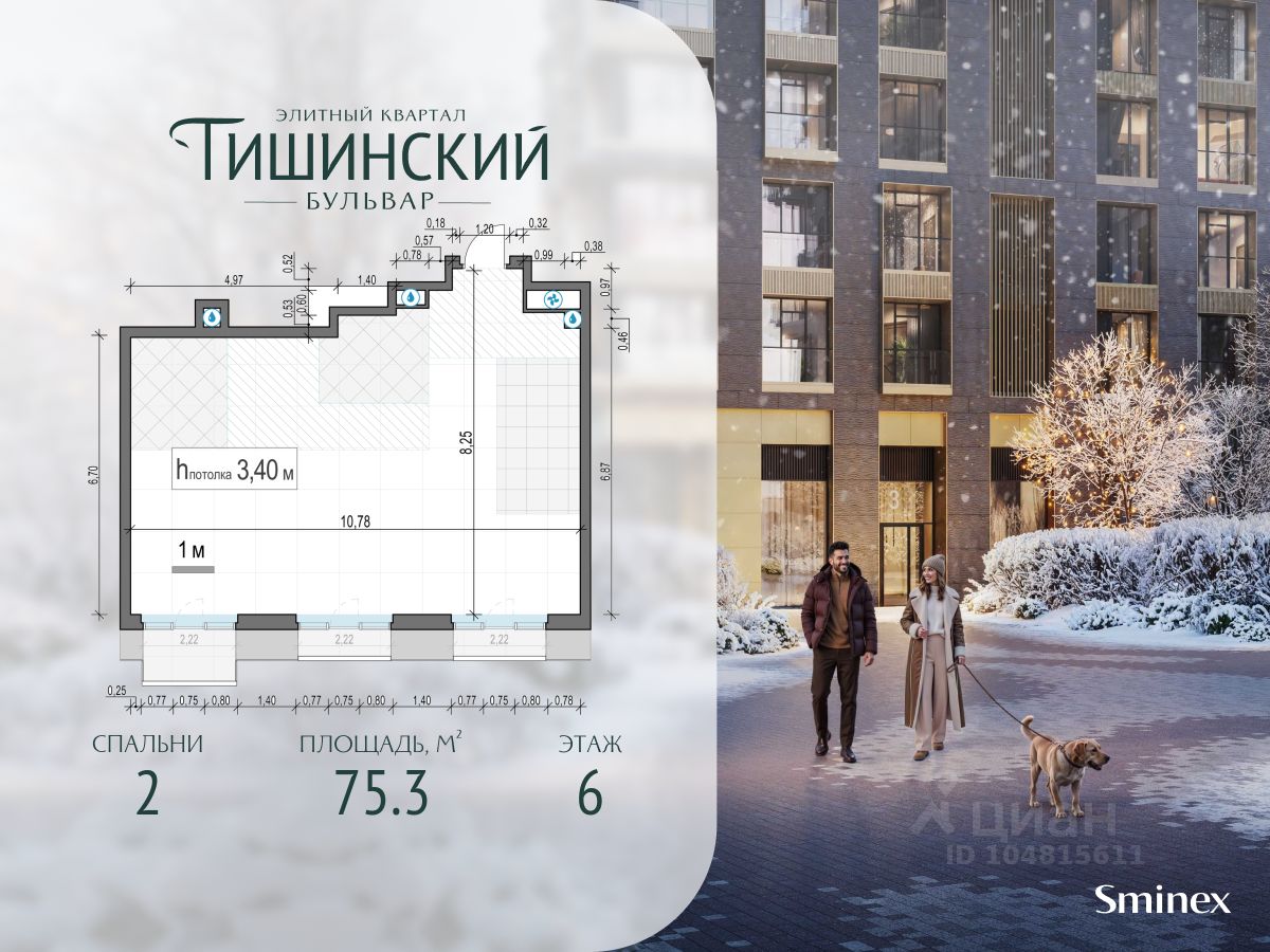 В продаже 2-комнатная квартира квартира в элитном квартале ''Тишинский бульвар''. Общая площадь квартиры - 75.30 кв.м. Этаж 6 из 9. Корпус Кленовый 3. ''Тишинский бульвар'' - тихий зелёный элитный квартал на Тишинке, в престижном и комфортном районе центра Москвы. В нём создан уникальный для элитного дома прогулочный бульвар в своём огромном парке 1,9 га. В парке оборудованы зоны для активного и тихого отдыха, крытые галереи, приватные зелёные комнаты, многофункциональная спортивная площадка, воркаут-зона, детская площадка, сухой фонтан, ручей. В пешей доступности Римско-католический кафедральный собор. Всего в полутора километрах от квартала находятся Патриаршие пруды - излюбленное место для летних прогулок, воскресных бранчей и романтических ужинов. Белая площадь расположена ещё ближе - на расстоянии 1,2 километра. Это точка концентрации деловой жизни и модных ресторанов. В ''Тишинский бульваре'' только для жителей и их гостей создан уникальный для элитного дома прогулочный бульвар в собственном огромном парке площадью 2,1 га, который занимает 70% территории квартала. Бульвар проходит через весь квартал и объединяет в общее пространство три двора: Кленовый, Рябиновый и Ивовый. В парке созданы крытые галереи и приватные зелёные комнаты для отдыха и медитаций в любую погоду. Насыщенное озеленение многолетними растениями с разными периодами цветения сохраняет территорию квартала красивой круглый год. В квартале насыщенная инфраструктура только для жителей, включая Clubhouse. Здесь оборудованы пространства для здорового образа жизни по стандарту FIT LAB: в парке - многофункциональная спортивная площадка, воркаут-зона, место для занятий йогой и медитации, бесплатный фитнес-клуб с бассейном. Для маленьких жителей доступны детская площадка и игровая комната по стандарту KIDS LAB. Дома оснащены самыми полными и лучшими системами.