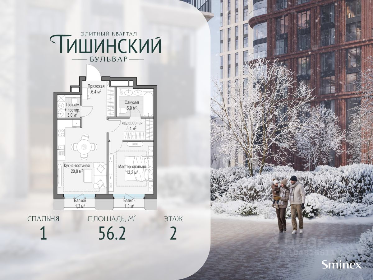 В продаже 1-комнатная квартира квартира в элитном квартале ''Тишинский бульвар''. Общая площадь квартиры - 56.20 кв.м. Этаж 2 из 7. Корпус Ивовый 4. ''Тишинский бульвар'' - тихий зелёный элитный квартал на Тишинке, в престижном и комфортном районе центра Москвы. В нём создан уникальный для элитного дома прогулочный бульвар в своём огромном парке 1,9 га. В парке оборудованы зоны для активного и тихого отдыха, крытые галереи, приватные зелёные комнаты, многофункциональная спортивная площадка, воркаут-зона, детская площадка, сухой фонтан, ручей. В пешей доступности Римско-католический кафедральный собор. Всего в полутора километрах от квартала находятся Патриаршие пруды - излюбленное место для летних прогулок, воскресных бранчей и романтических ужинов. Белая площадь расположена ещё ближе - на расстоянии 1,2 километра. Это точка концентрации деловой жизни и модных ресторанов. В ''Тишинский бульваре'' только для жителей и их гостей создан уникальный для элитного дома прогулочный бульвар в собственном огромном парке площадью 2,1 га, который занимает 70% территории квартала. Бульвар проходит через весь квартал и объединяет в общее пространство три двора: Кленовый, Рябиновый и Ивовый. В парке созданы крытые галереи и приватные зелёные комнаты для отдыха и медитаций в любую погоду. Насыщенное озеленение многолетними растениями с разными периодами цветения сохраняет территорию квартала красивой круглый год. В квартале насыщенная инфраструктура только для жителей, включая Clubhouse. Здесь оборудованы пространства для здорового образа жизни по стандарту FIT LAB: в парке - многофункциональная спортивная площадка, воркаут-зона, место для занятий йогой и медитации, бесплатный фитнес-клуб с бассейном. Для маленьких жителей доступны детская площадка и игровая комната по стандарту KIDS LAB. Дома оснащены самыми полными и лучшими системами.